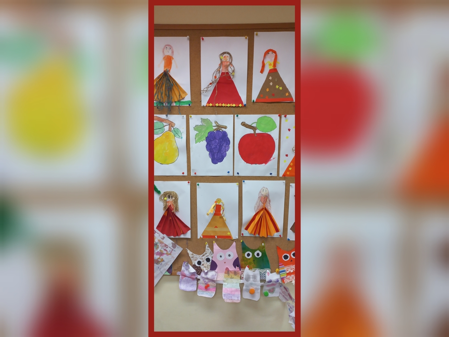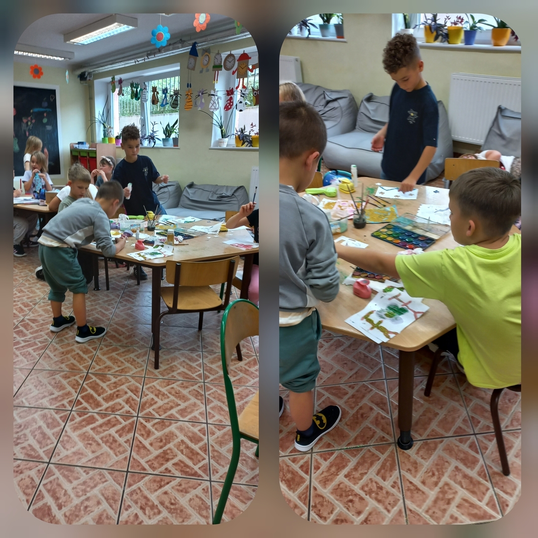plastycznych. Rysunki kredkami i farbami, kompozycje z liści, wyklejanki