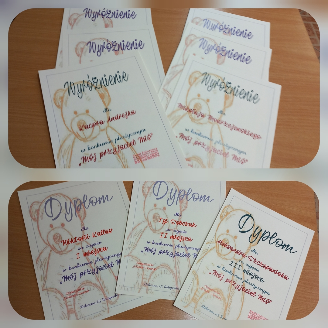 Konkurs plastyczny „Mój przyjaciel Miś” został zorganizowany z myślą o obchodach „Światowego Dnia Pluszowego Misia”. W konkursie wzięli udział chętni uczniowie klas 1-3 uczęszczający do świetlicy szkolnej. Zadaniem uczestników konkursu było wykonanie pracy plastycznej przedstawiającej postać ulubionego misia.Na konkurs wpłynęły 42 prace wykonane różnymi technikami,które ocenili nauczyciele świetlicy. Dzieci wykazały się kreatywnością, wyobraźnią oraz talentem plastycznym. Każda z prac była wyjątkowa i pełna uroku, dlatego wybór najlepszych był niezwykle trudny.