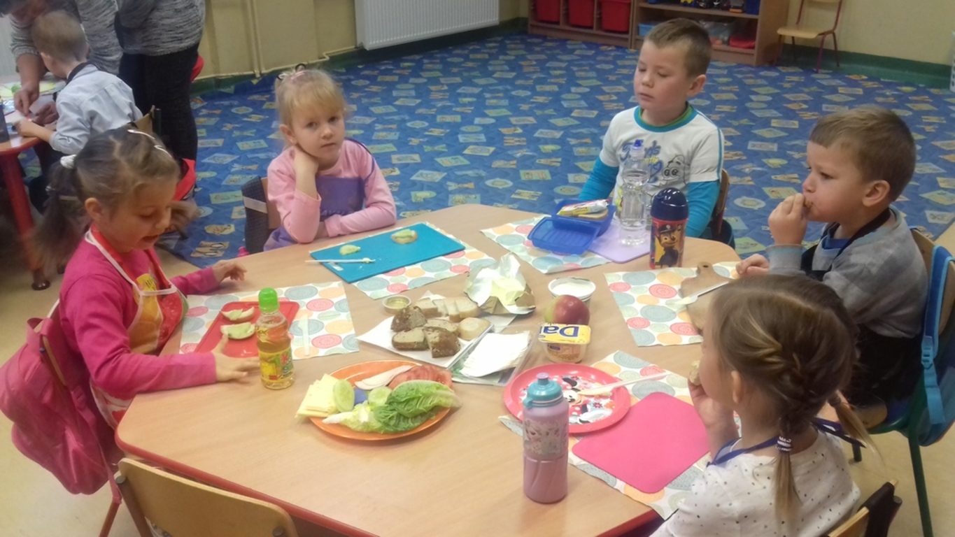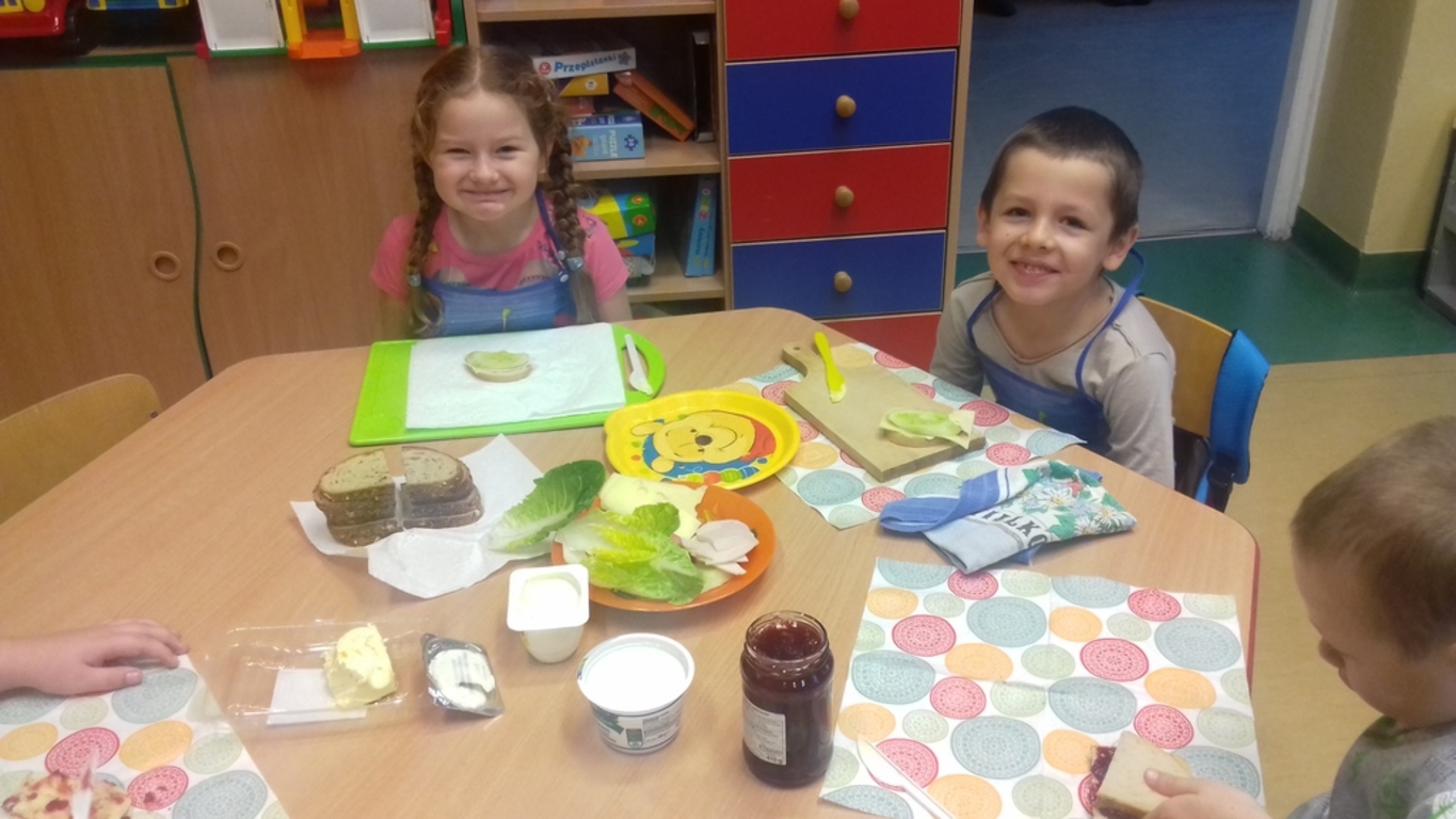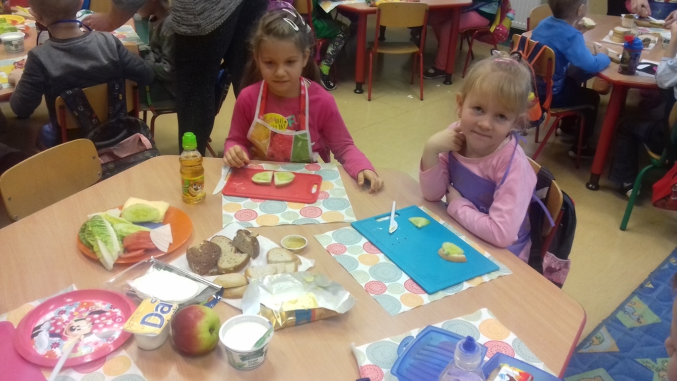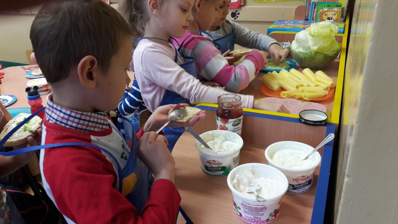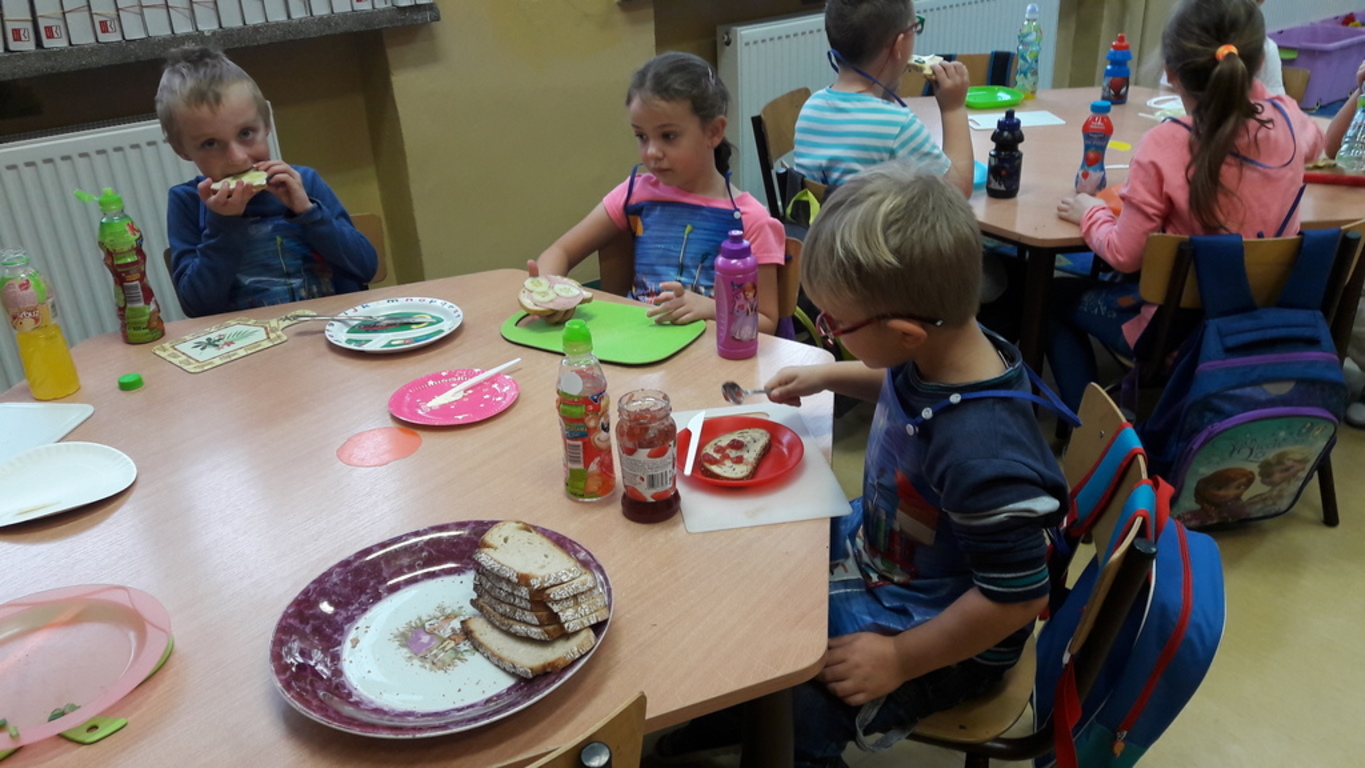 Śniadanie jak wszyscy wiemy to najwazniejszy posiłek dnia. Dzięki niemu dzieci, młodzież i dorośli mają energię do zabawy, nauki i pracy. Po śniadaniu jest lepsza koncentracja oraz siła. To najlepszy start w nowy dzień. 8 LISTOPADA obchodzony jest EUROPEJSKI DZIEŃ ZDROWEGO JEDZENIA I GOTOWANIA. W wielu przedszkolach i szkołach odbywa sie w tym dniu akcja pod haslem "ŚNIADANIE DAJE MOC ". Również w naszej szkole taka akcja odbyła się w dwóch oddziałach przedszkolnych. W tym dniu dzieci samodzielnie przygotowały ?śniadanie. Dzieci robiły kanapki z produktów, które wspólnie przygotowały z opiekunami. Na stolikach nie zabrakło pieczywa pełnoziarnistego, serów, twarożków oraz warzyw. Dzieci najbardziej uradowane były faktem, że same mogły robić kanapki .Było smacznie, zdrowo i kolorowo.