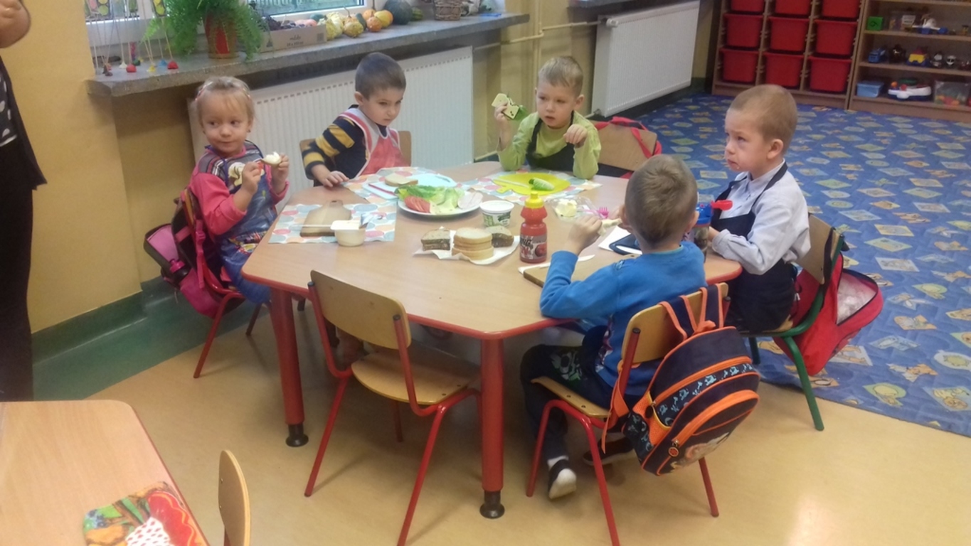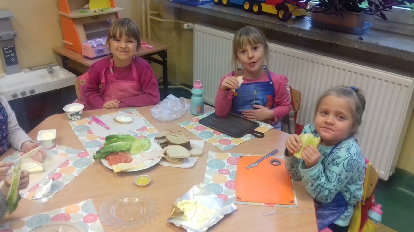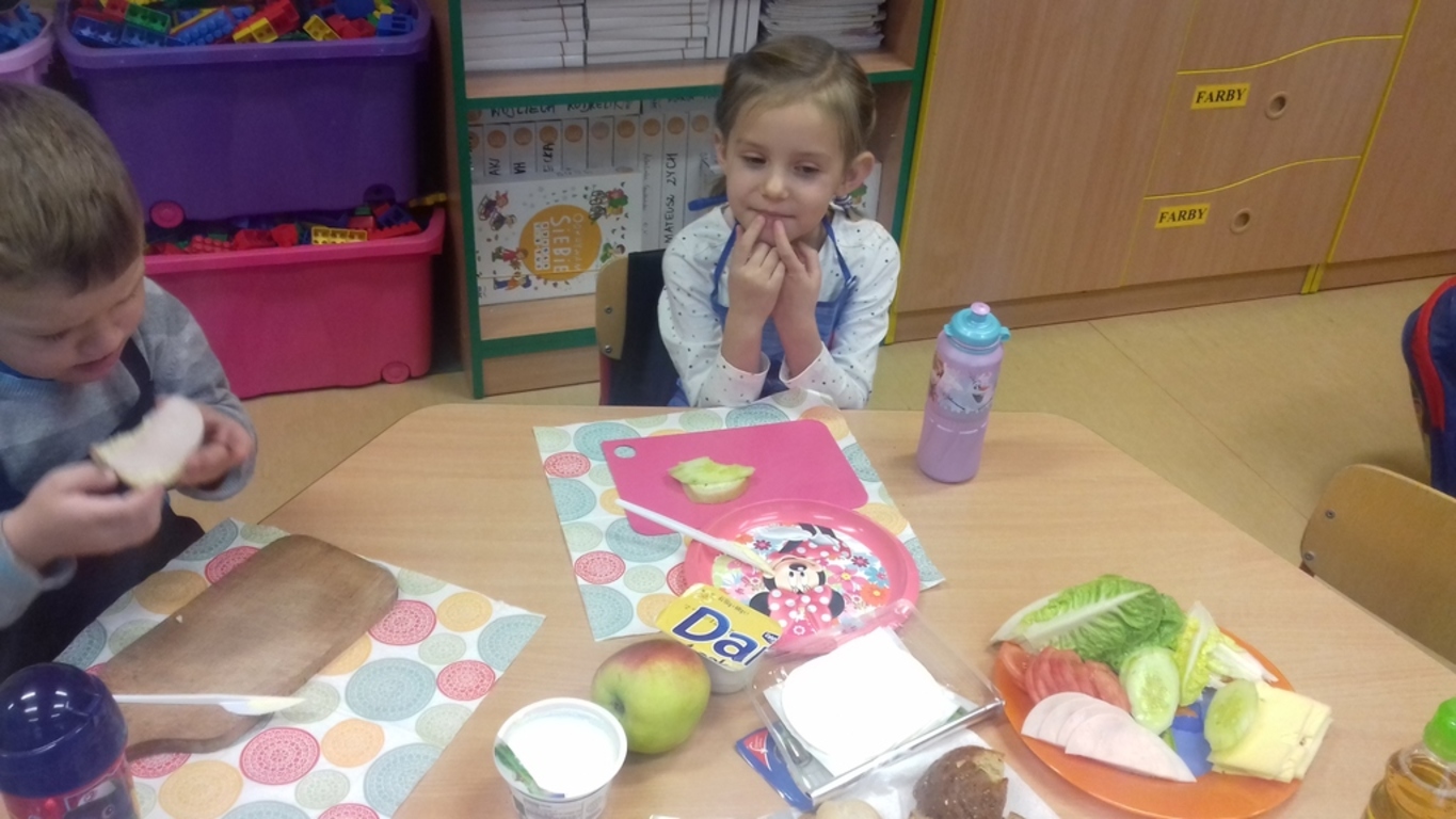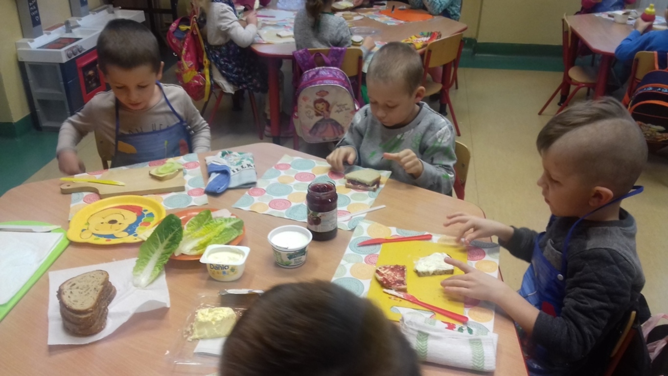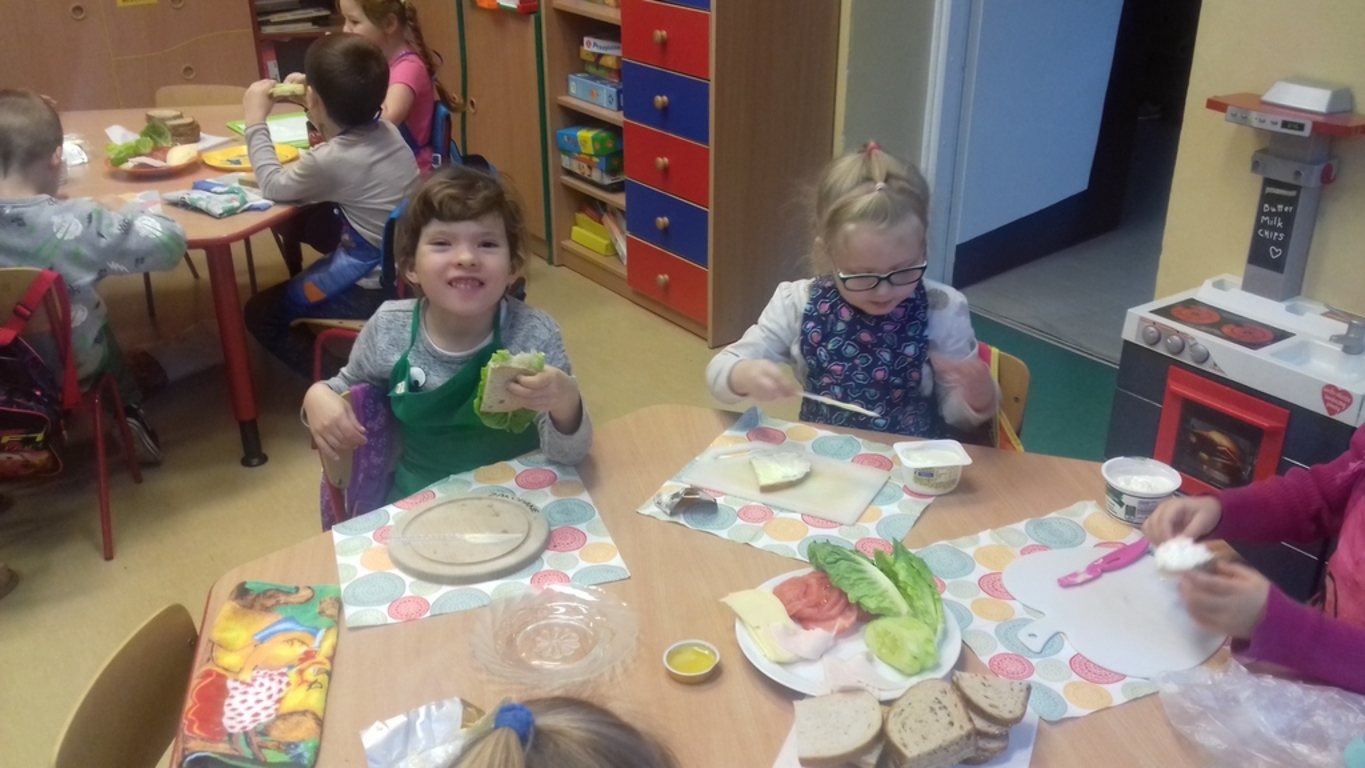 Śniadanie jak wszyscy wiemy to najwazniejszy posiłek dnia. Dzięki niemu dzieci, młodzież i dorośli mają energię do zabawy, nauki i pracy. Po śniadaniu jest lepsza koncentracja oraz siła. To najlepszy start w nowy dzień. 8 LISTOPADA obchodzony jest EUROPEJSKI DZIEŃ ZDROWEGO JEDZENIA I GOTOWANIA. W wielu przedszkolach i szkołach odbywa sie w tym dniu akcja pod haslem "ŚNIADANIE DAJE MOC ". Również w naszej szkole taka akcja odbyła się w dwóch oddziałach przedszkolnych. W tym dniu dzieci samodzielnie przygotowały ?śniadanie. Dzieci robiły kanapki z produktów, które wspólnie przygotowały z opiekunami. Na stolikach nie zabrakło pieczywa pełnoziarnistego, serów, twarożków oraz warzyw. Dzieci najbardziej uradowane były faktem, że same mogły robić kanapki .Było smacznie, zdrowo i kolorowo.