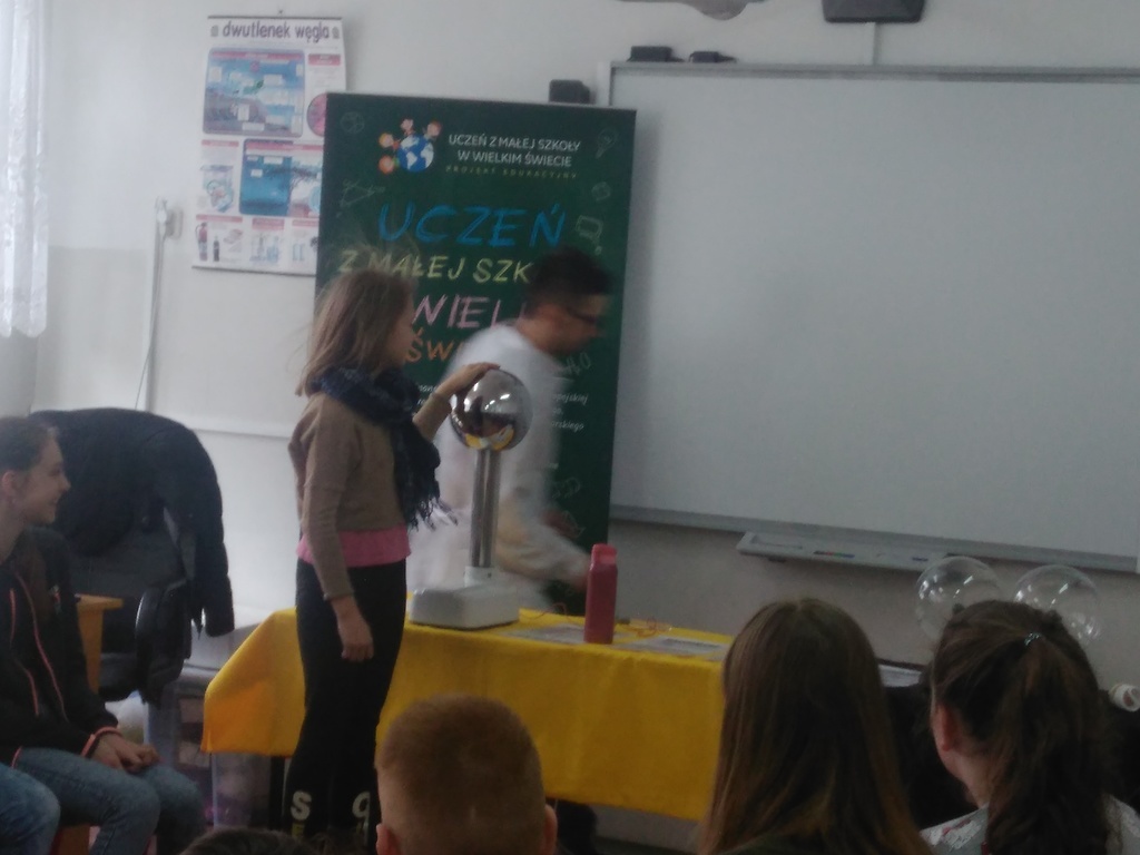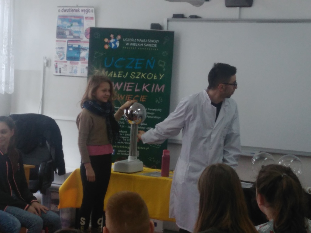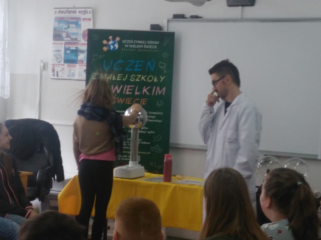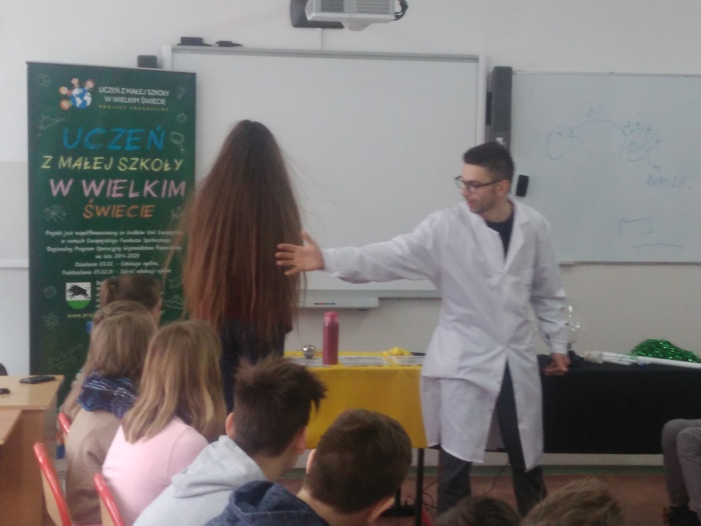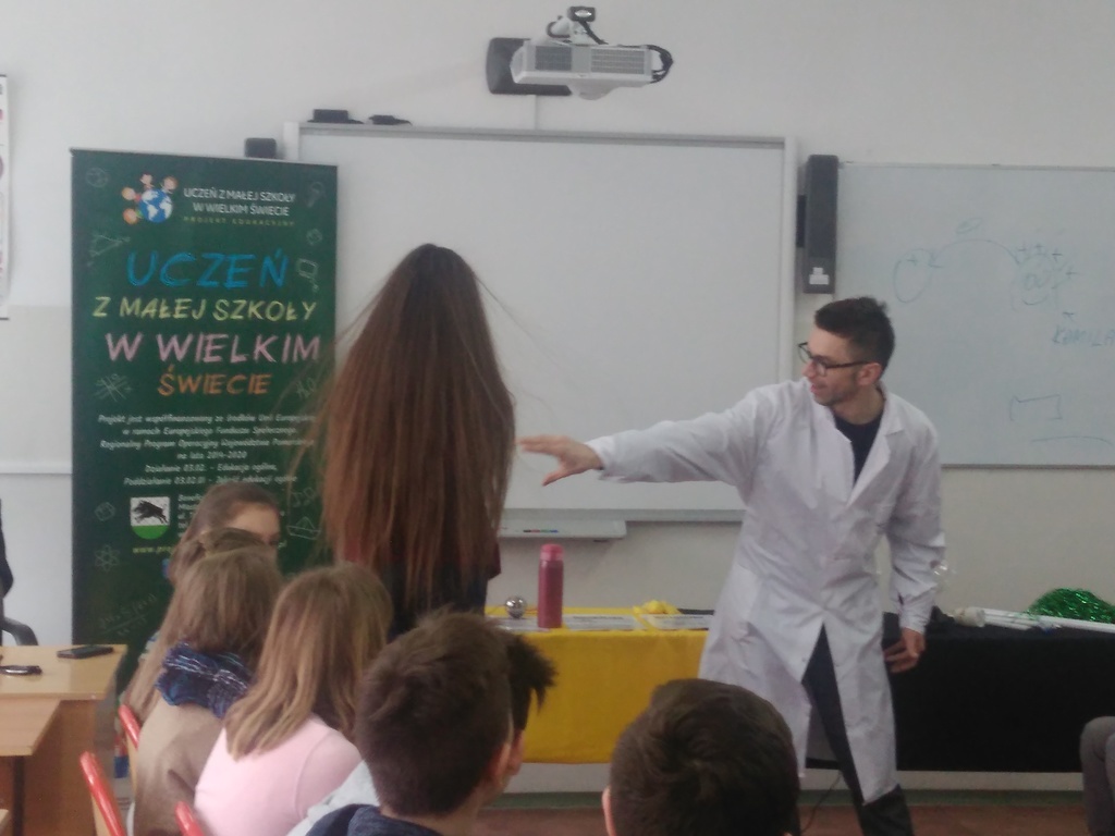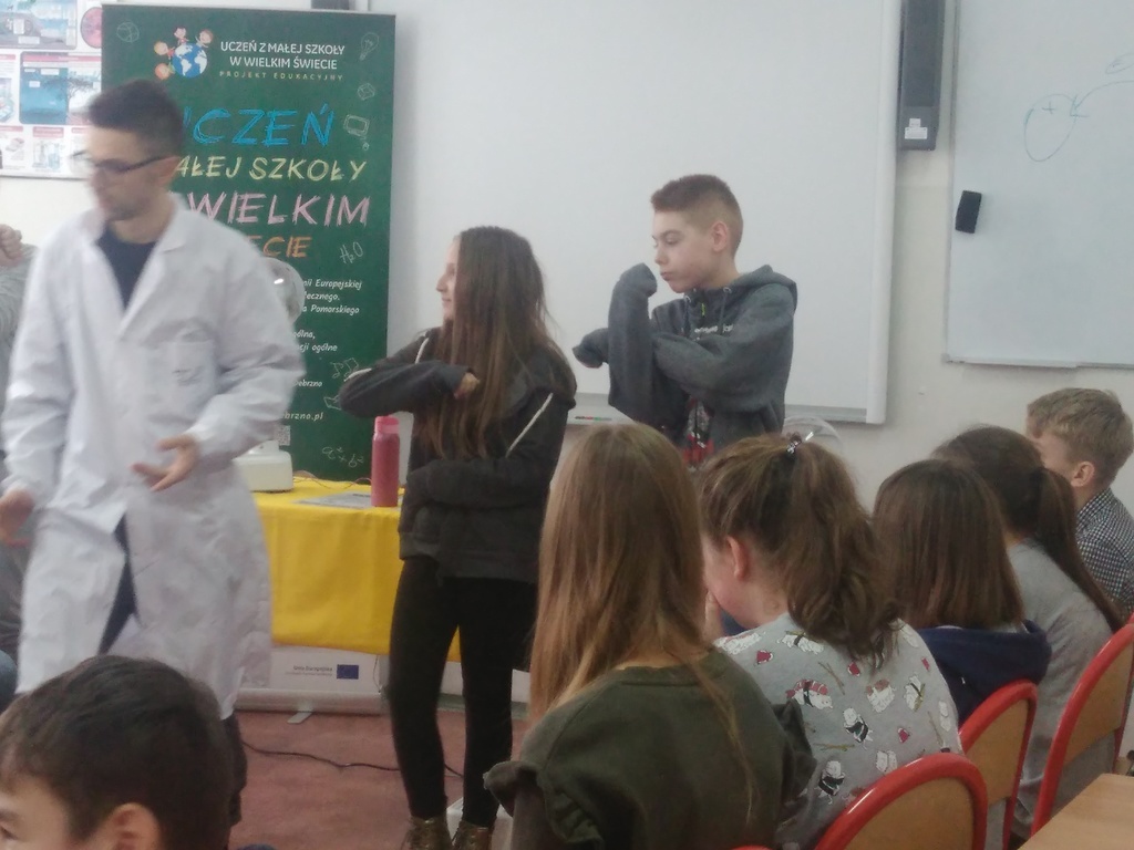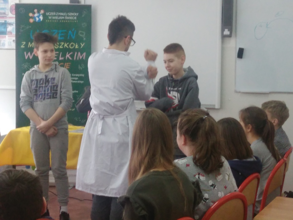 W ramach projektu "Uczeń z małej szkoły w wielkim świecie" w naszej szkole odbywają się zajęcia interaktywne. Uczniowie szkoły podstawowej uczestniczyli w zajęciach "Potęga elektryczności", a młodzież gimnazjum odkrywała tajemnice kryminologii badając swoje odciski palców i dna oraz pozyskując sztuczną krew. Zajęcia prowadzili edukatorzy z Centrum Interaktywnej Edukacji i Zabawy EduFan z Gdańska. Zapraszamy na kolejne zajęcia.