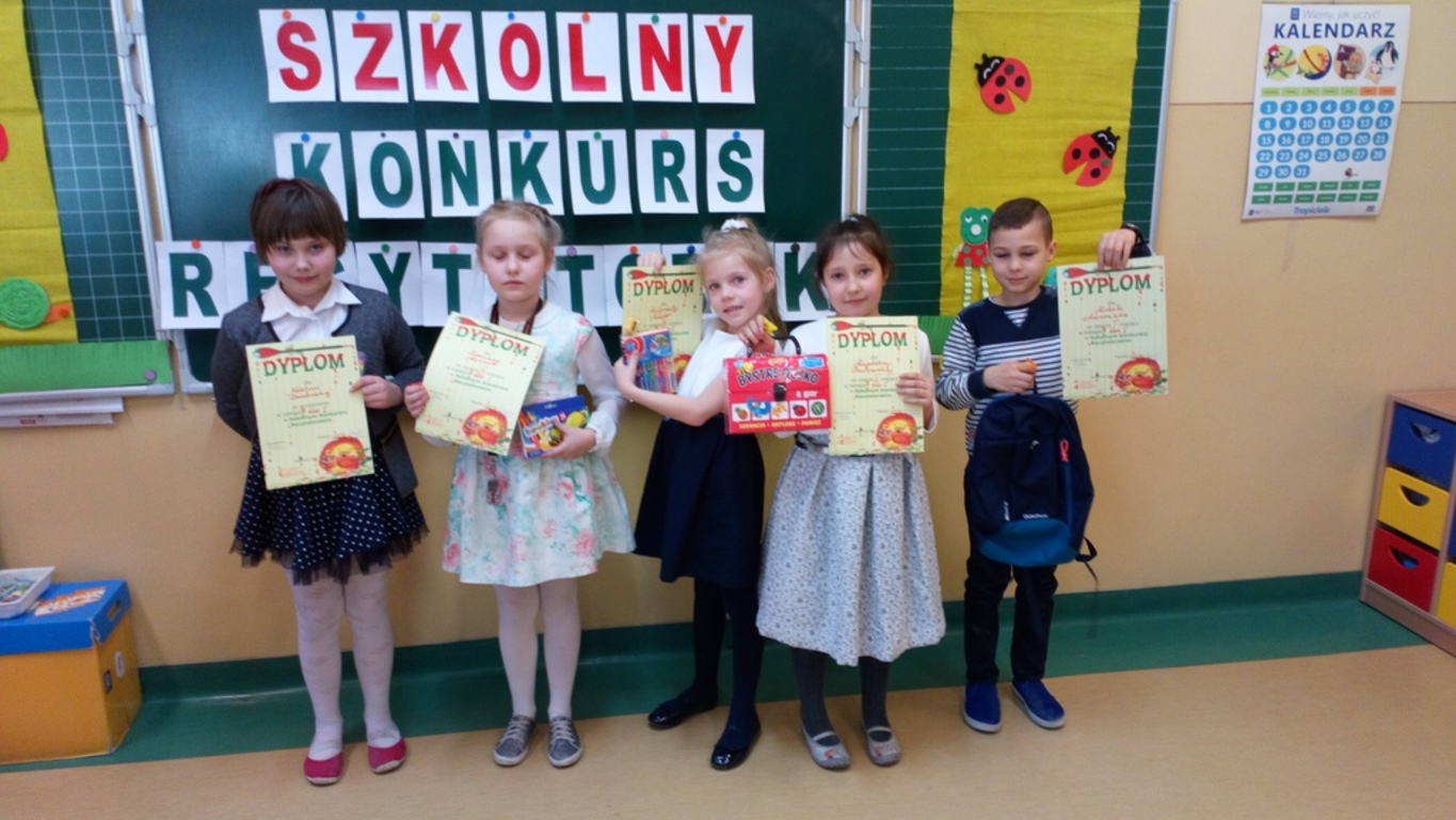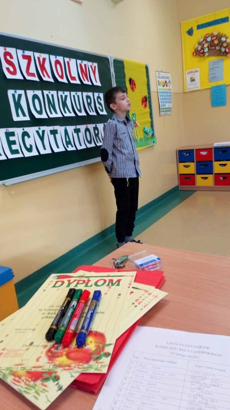 23 lutego 2018 r. w naszej szkole odbyła się kolejna edycja Szkolnego Konkursu Recytatorskiego, w którym wzięło udział 20 uczestników- reprezentantów kl. I-III szkoły podstawowej. Celem konkursu było propagowanie piękna poezji, rozwijanie aktorskich uzdolnień dzieci, a także wyłonienie najlepszych recytatorów z naszej szkoły do gminnego etapu konkursu organizowanego przez CKSiT w Debrznie.