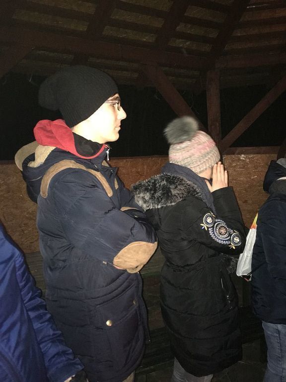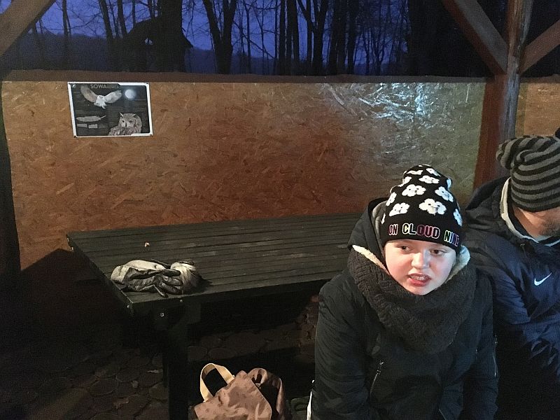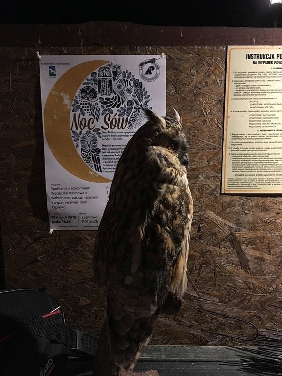Spotkanie sowy to unikatowe zjawisko, dlatego też były one wabione odgłosami tych ptaków. Nawet taki wybieg nie gwarantuje powodzenia zobaczenia sowy. Nam jednak sprzyjało szczęście i po przejściu ok. 4 km. najpierw usłyszeliśmy wołania puszczyka, a potem mieliśmy okazję zobaczyć go w świetle nocnego nieba na bezlistnej gałęzi dębu. Radości było co nie miara. Przez spory kawałek duktu ptak leciał za nami pohukując groźnie.
