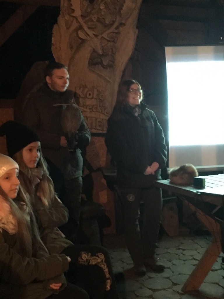 23 marca dzięki hojności Koła Łowieckiego Orzeł, które sponsorowało przejazd busem, uczniowie z naszej szkoły wraz z opiekunkami panią Jolantą Matysik i panią Grażyną Twierkowską mieli przyjemność uczestniczyć w tej akcji. Gościliśmy w leśniczówce Potulice, gdzie najpierw została przedstawiona prezentacja multimedialna przygotowana przez panią Dominikę Nadolną, następnie kilka słów o ptakach drapieżnych wygłosił zaproszony sokolnik. Podczas zajęć praktycznych podzieleni na grupy uczestnicy spotkania razem z przewodnikami powędrowali ciemnym lasem na obserwacje.