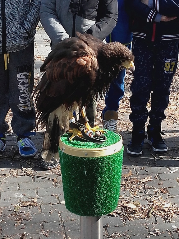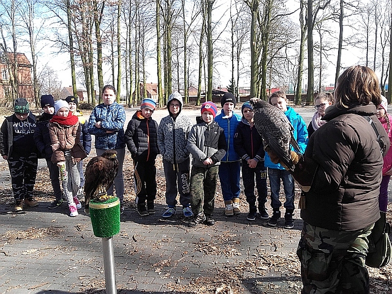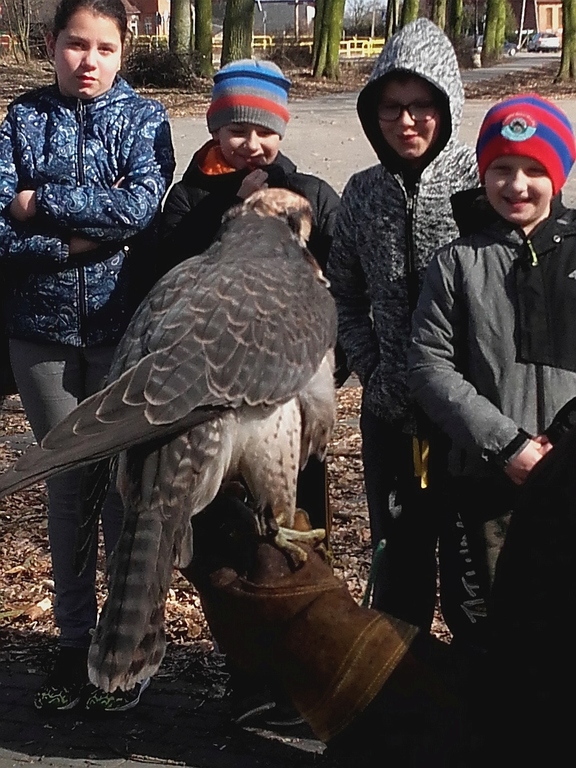 Przez cały marzec 2017 r, w parku miejskim przebywała pani sokolnik, której ptaki - sokół i jastrząb – płoszyły mieszkające tam wrony. Uczniowie mieli okazję porozmawiać na temat pracy sokolnika i hodowli ptaków drapieżnych. Obydwa ptaki zaprezentowały swoje umiejętności.