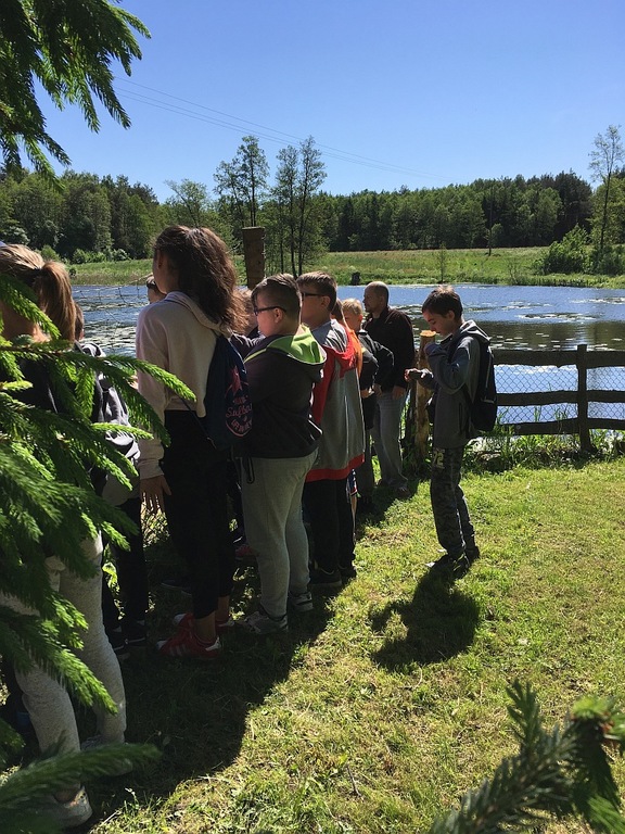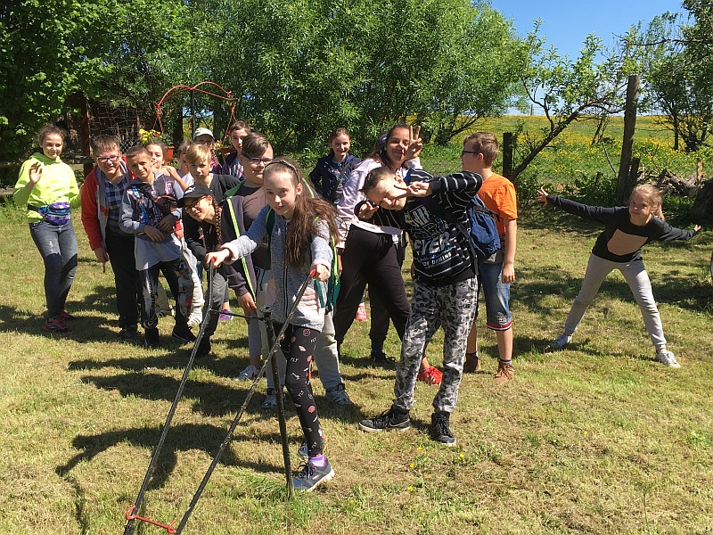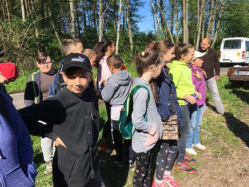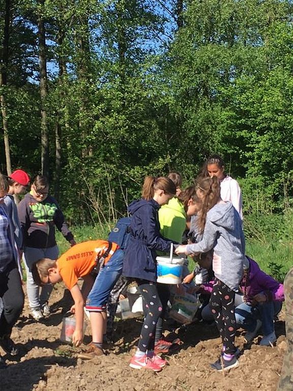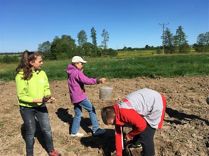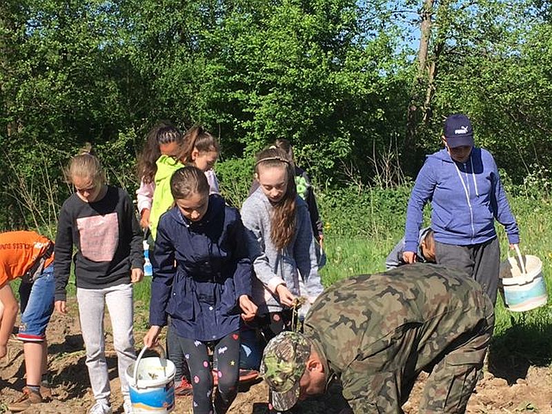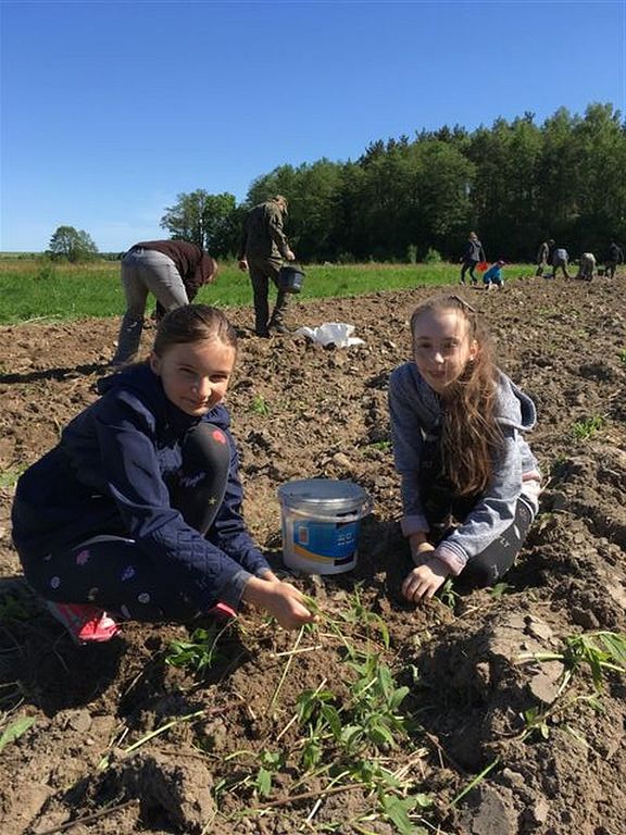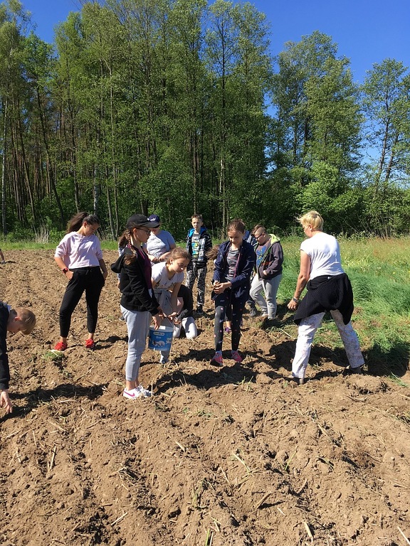 Takie właśnie bulwy zbierali uczniowie klasy V c wraz z wychowawczynią panią Jolantą Matysik. W ramach współpracy z Kołem Łowieckim Orzeł, 19 maja 2018 roku pomagali myśliwym w zbieraniu tej rośliny. Koło od lat uprawia topinambur na paszę dla zwierząt w postaci zielonej, jak również bulw, którymi chętnie żywią się dziki. Uczniowie w pełni byli zaangażowani w pracę na polu. Następnie już po raz kolejny mieli okazję odwiedzić siedzibę koła, a tam czekało na nich ognisko, słodycze, napoje i skromne upominki. Niewątpliwą atrakcją okazały się daniele, które swobodnie poruszały się po terenie przyległy do Bażantarni. Dzieci mogły obserwować te zwierzęta z bardzo bliskiej odległości, a nawet nakarmić je. Pełni nowych wrażeń uczniowie klasy V c wrócili do domów.