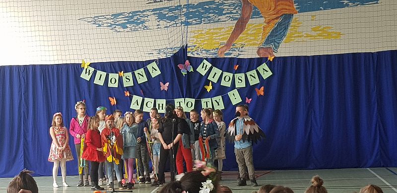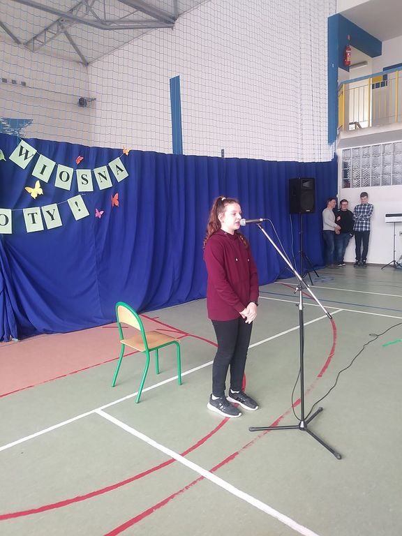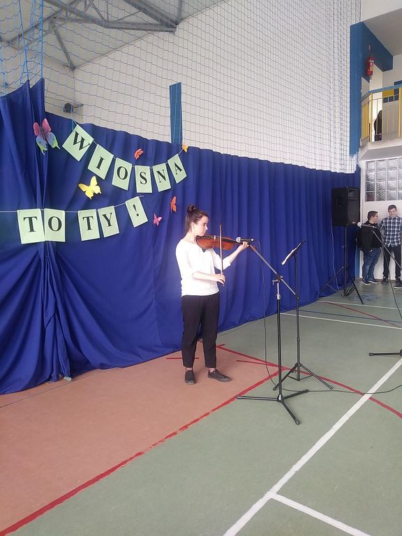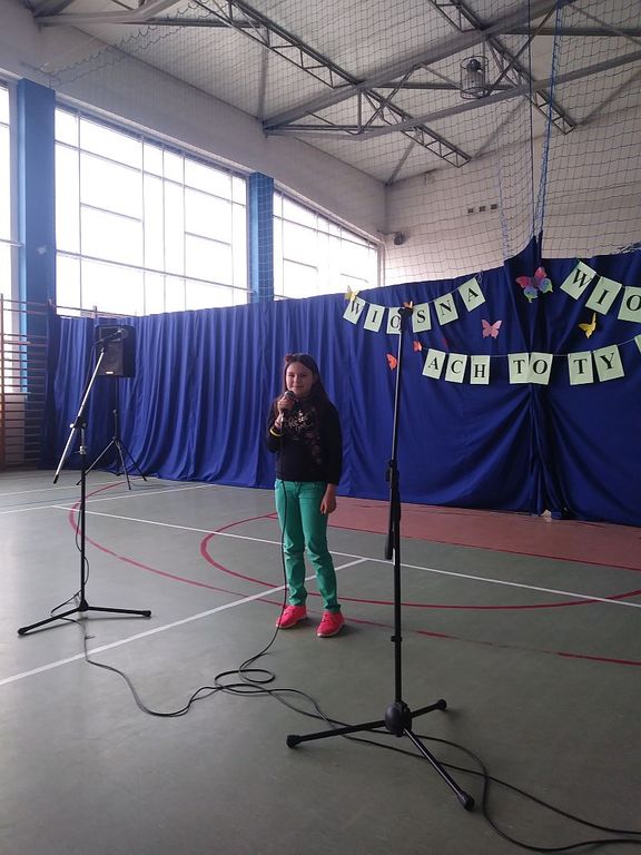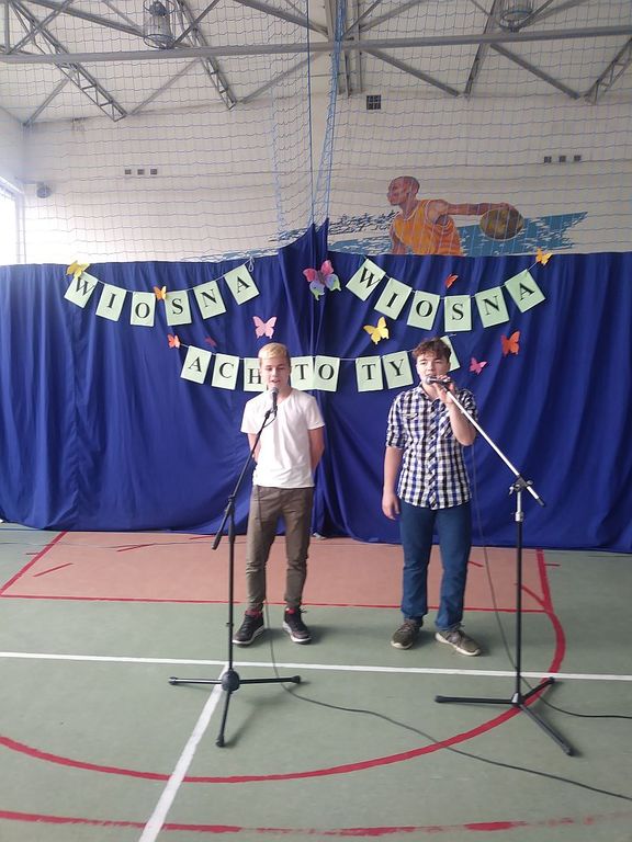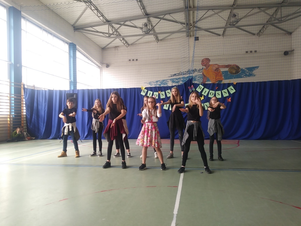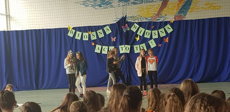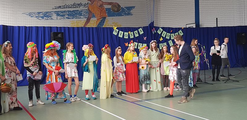 Pierwszym akcentem było przedstawienie się uczniów przebranych za Panią Wiosnę. Tę konkurencję wygrała Dajana Prymas, uczennica z klasy VIIIA, która swoim przebraniem zachwyciła publiczność i jury. Następnie każda klasa prezentowała się w tańcu, muzyce lub odgrywanych skeczach. Tegorocznymi zwycięzcami zostali Kasjan Nielek i Dominik Mudyna, uczniowie IIIb gimnazjum.