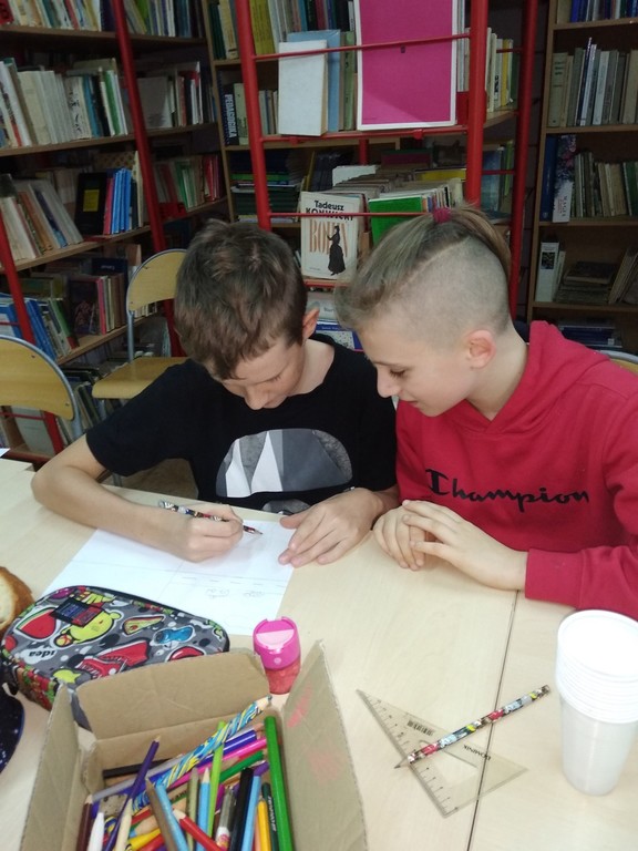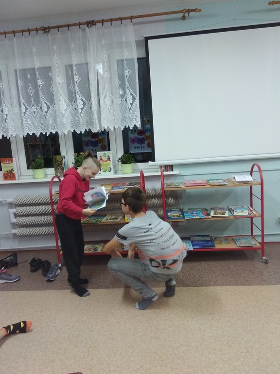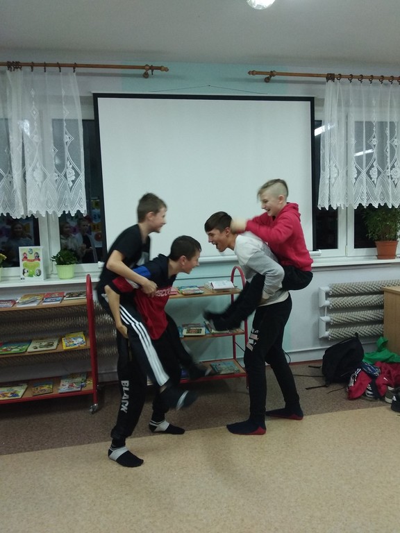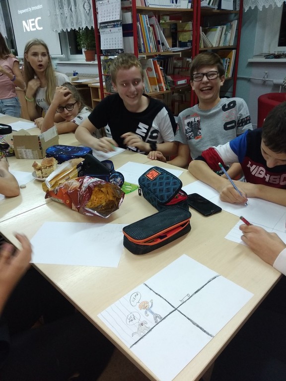 Wzmocnieni pysznym poczęstunkiem bawiliśmy się w zastyganie i udawanie manekinów oraz w literackie kalambury. Następnie oglądaliśmy film pt. „Ptyś i Bill” i na jego podstawie wykonaliśmy komiks.