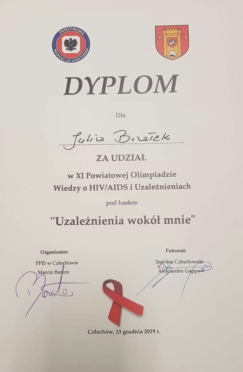 Nasi uczniowie zdobywają wiedzę o sposobach walki z nałogiem, sporo też wiedzą o samym zjawisku uzależnienia, jego istocie, przebiegu, formach i objawach. Potwierdzeniem skuteczności pracy i oddziaływań pedagogów jest udział naszej uczennicy Julii Białek z klasy VIIIc w konkursie profilaktycznym "Uzależnienia wokół mnie", który odbył się 13 grudnia w Miejskiej Bibliotece Publicznej w Człuchowie,