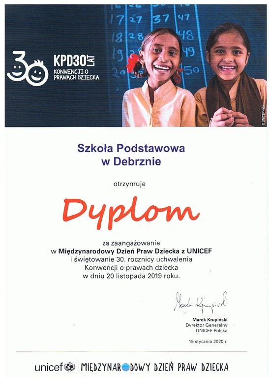 Dyrektor Generalny UNICEF Polska przesyła serdeczne podziękowania dla Dyrekcji, nauczycieli oraz uczniów Szkoły Podstawowej w Debrznie za zaangażowanie w obchody Międzynarodowego Dnia Praw Dziecka i świętowanie 30. rocznicy Konwencji o prawach dziecka.