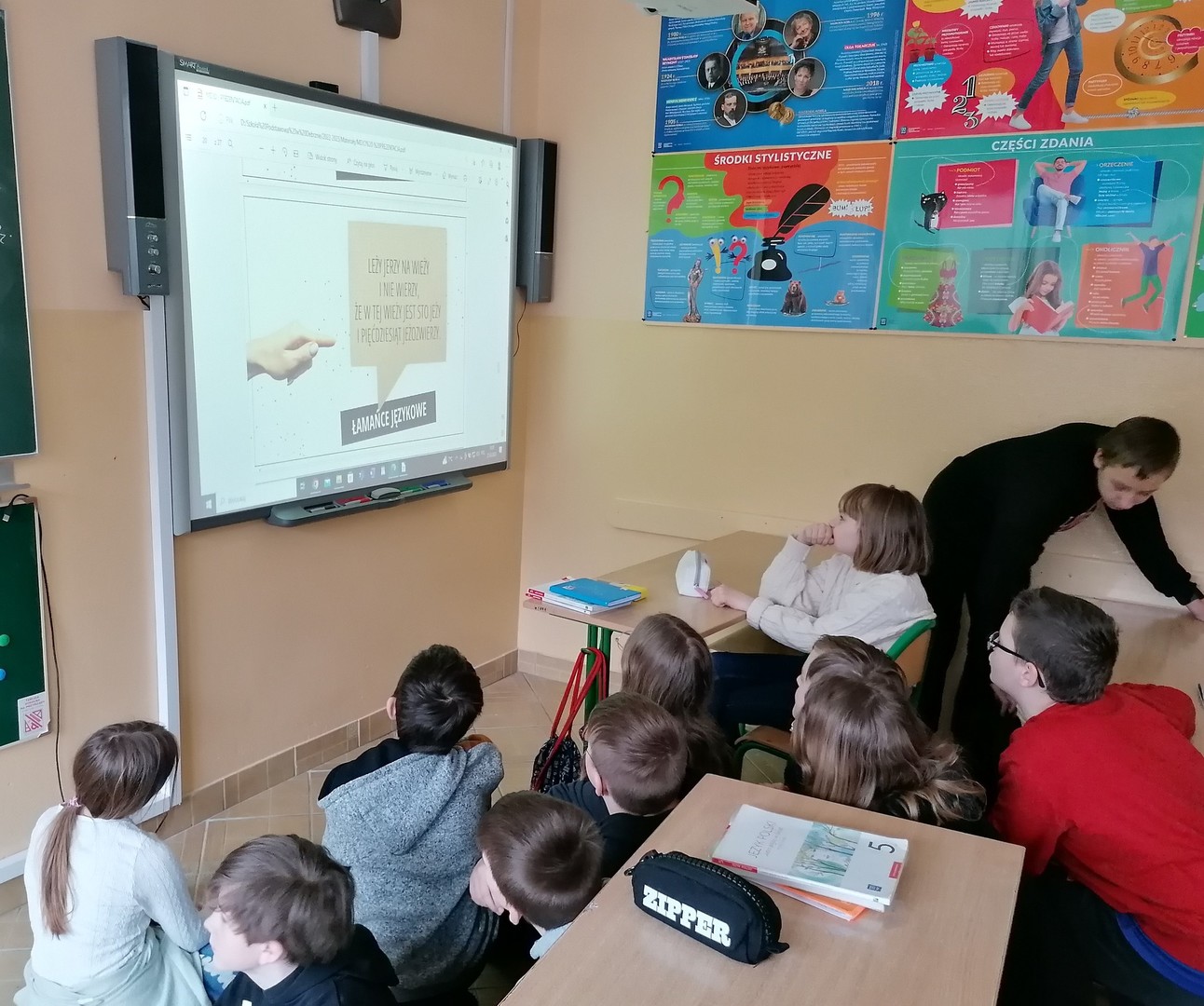 Była to zatem dobra okazja do tego, żeby w szczególny sposób przypomnieć sobie, dlaczego warto uczyć się języka polskiego, a także zastanowić się nad kulturą języka i poprawną polszczyzną. W trakcie zajęć języka polskiego rozmawialiśmy o zwyczajach, normach i najczęściej popełnianych błędach językowych oraz sposobach na wzbogacanie słownictwa. Uczniowie ochoczo uczestniczyli także w zabawach z językiem: przystąpili do rozszyfrowywania znaczenia frazeologizmów, bawili się w rymowane wyrazy i uczestniczyli w quizach tematycznych. Ogromnym zainteresowaniem cieszyły się wierszyki przepełnione trudnymi do wyartykułowania słowami. Zmagania z łamańcami językowymi okazały się nie lada wyzwaniem, niemniej jednak wprawiły wszystkich w radosne nastroje.