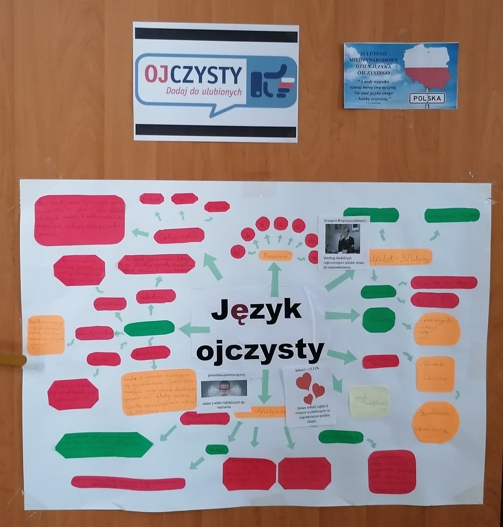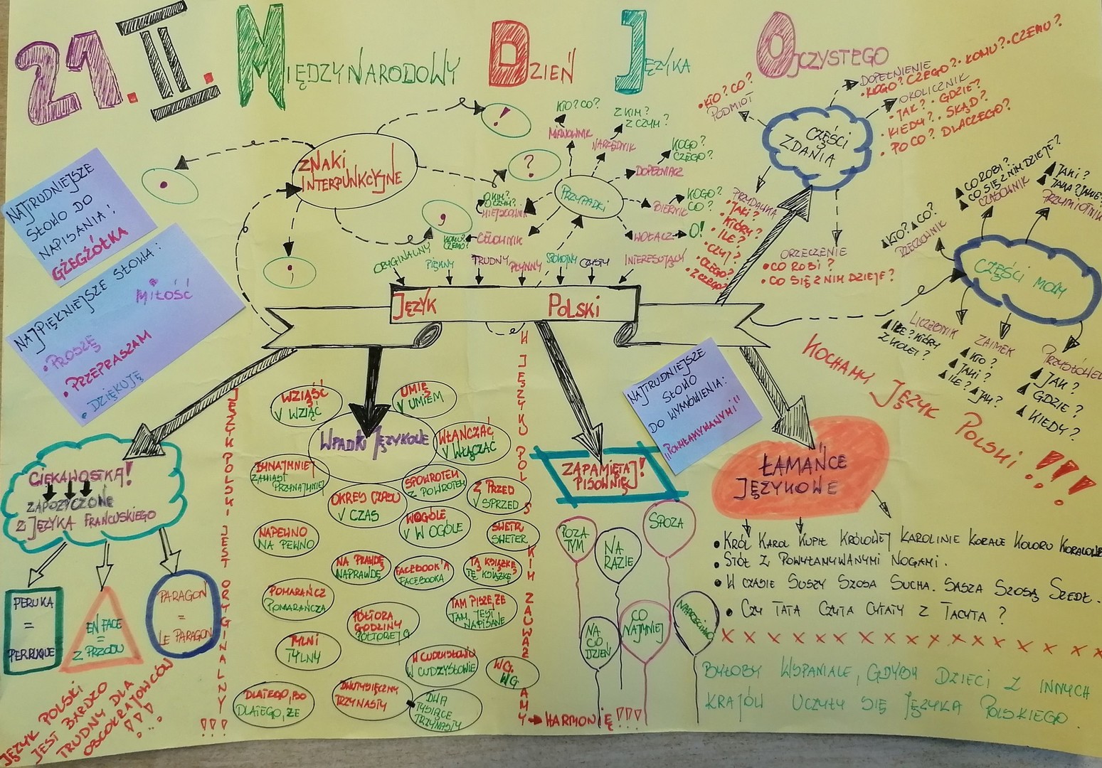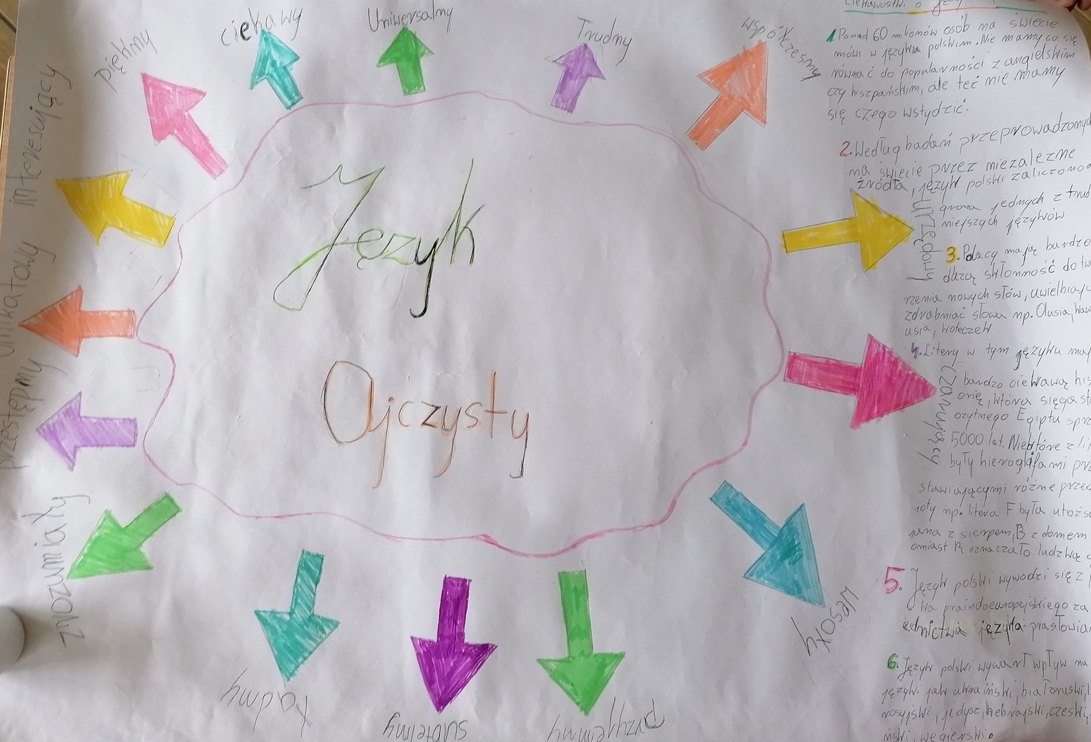 Chętni uczniowie podjęli się też zrealizowania zadań dodatkowych: stworzyli mapy myśli dotyczące języka ojczystego, na których umieścili ciekawostki językowe i swoje przemyślenia, wykonali plakaty z hasłami reklamującymi dbałość o poprawne posługiwanie się językiem polskim, a także wybrali i zilustrowali trzy wybrane przez siebie słowa z języka polskiego – najpiękniejsze, najtrudniejsze do wymówienia i najtrudniejsze do zapisania. Efekty ich prac można podziwiać w galerii.