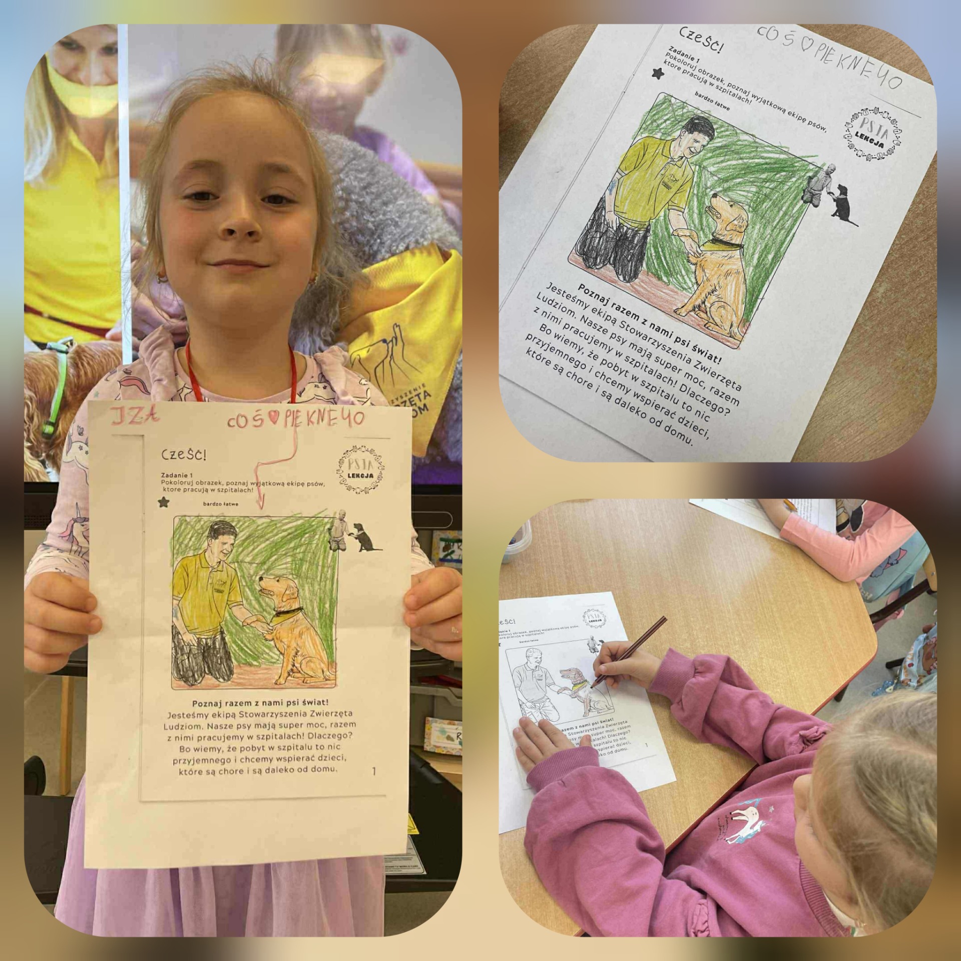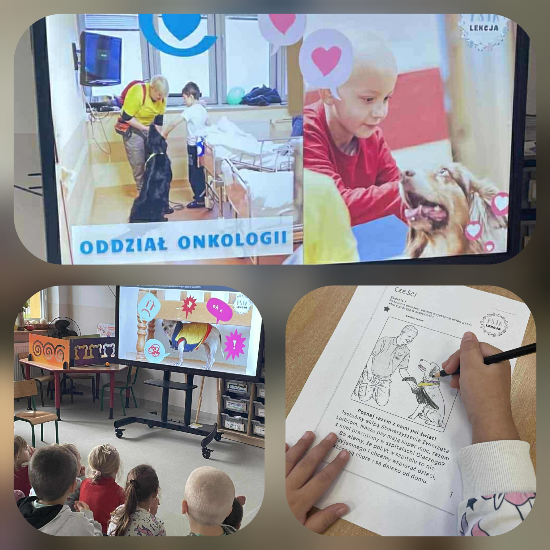 Dowiedzieliśmy się również, że psy ze stowarzyszenia pracują w szpitalach i pomagają dzieciom wracającym do zdrowia. Zajęcia były bardzo ciekawe i pouczające. Dzięki nim lepiej rozumiemy, jak ważny jest szacunek, odpowiedzialność i empatia wobec zwierząt.
