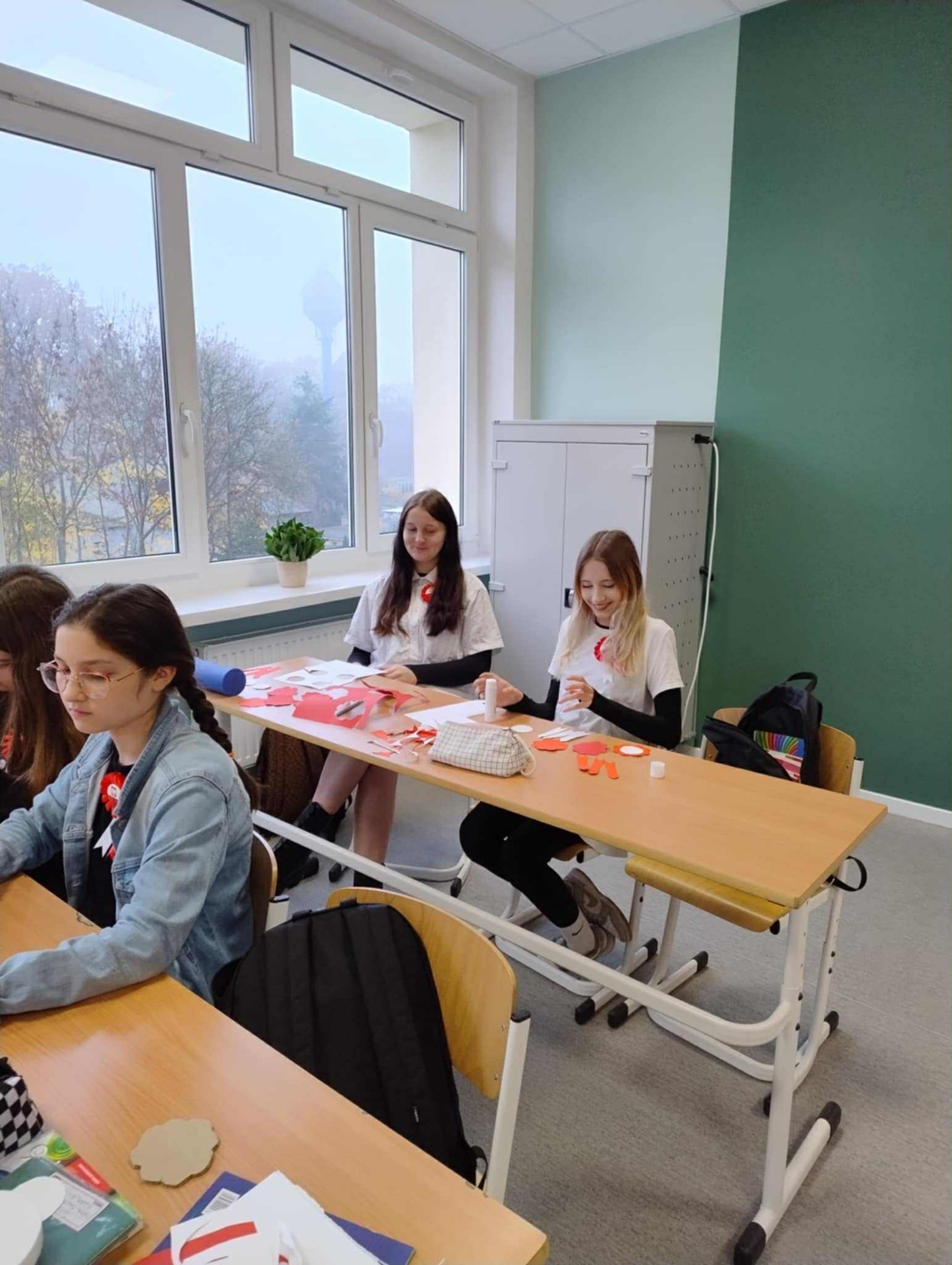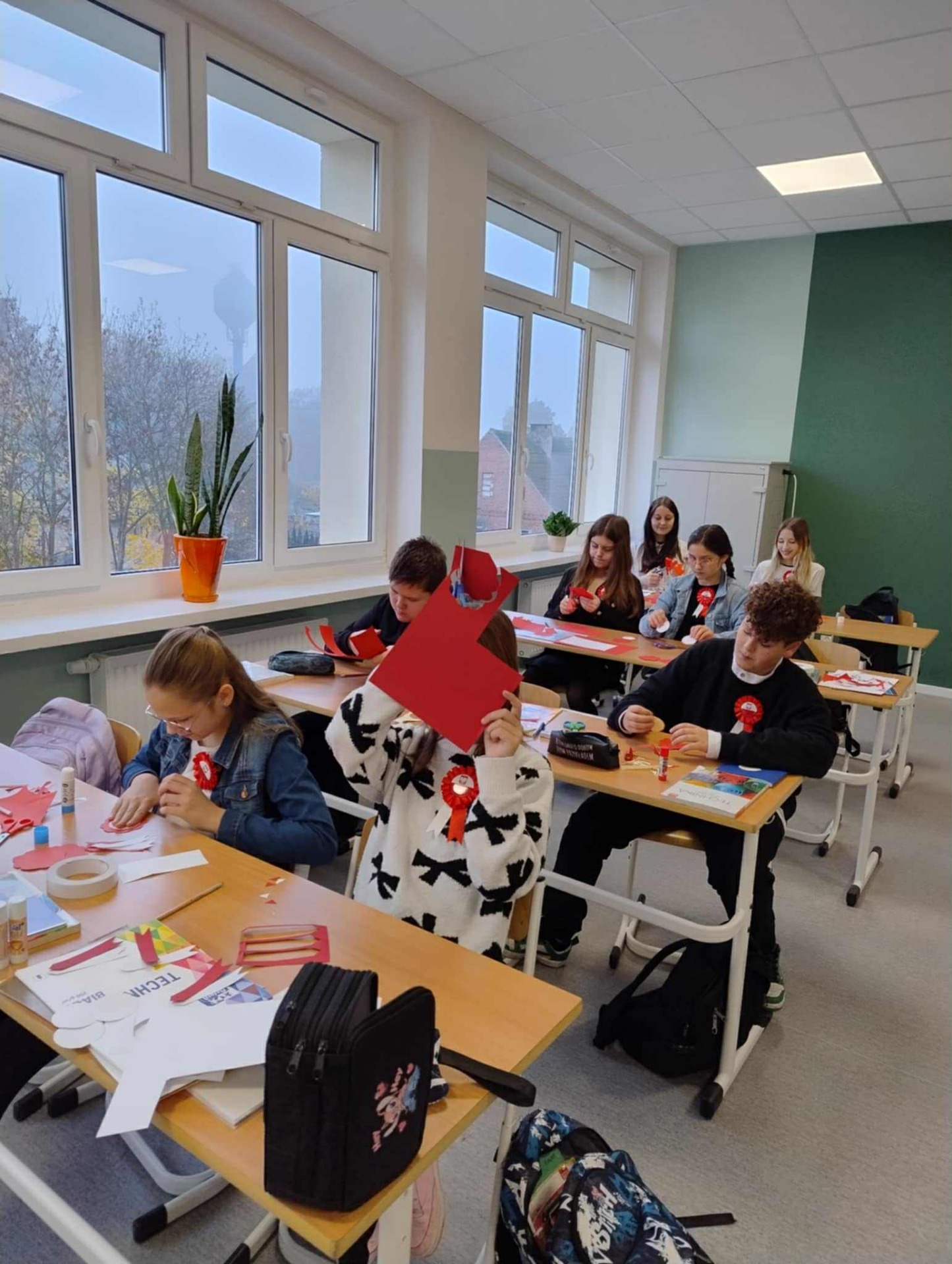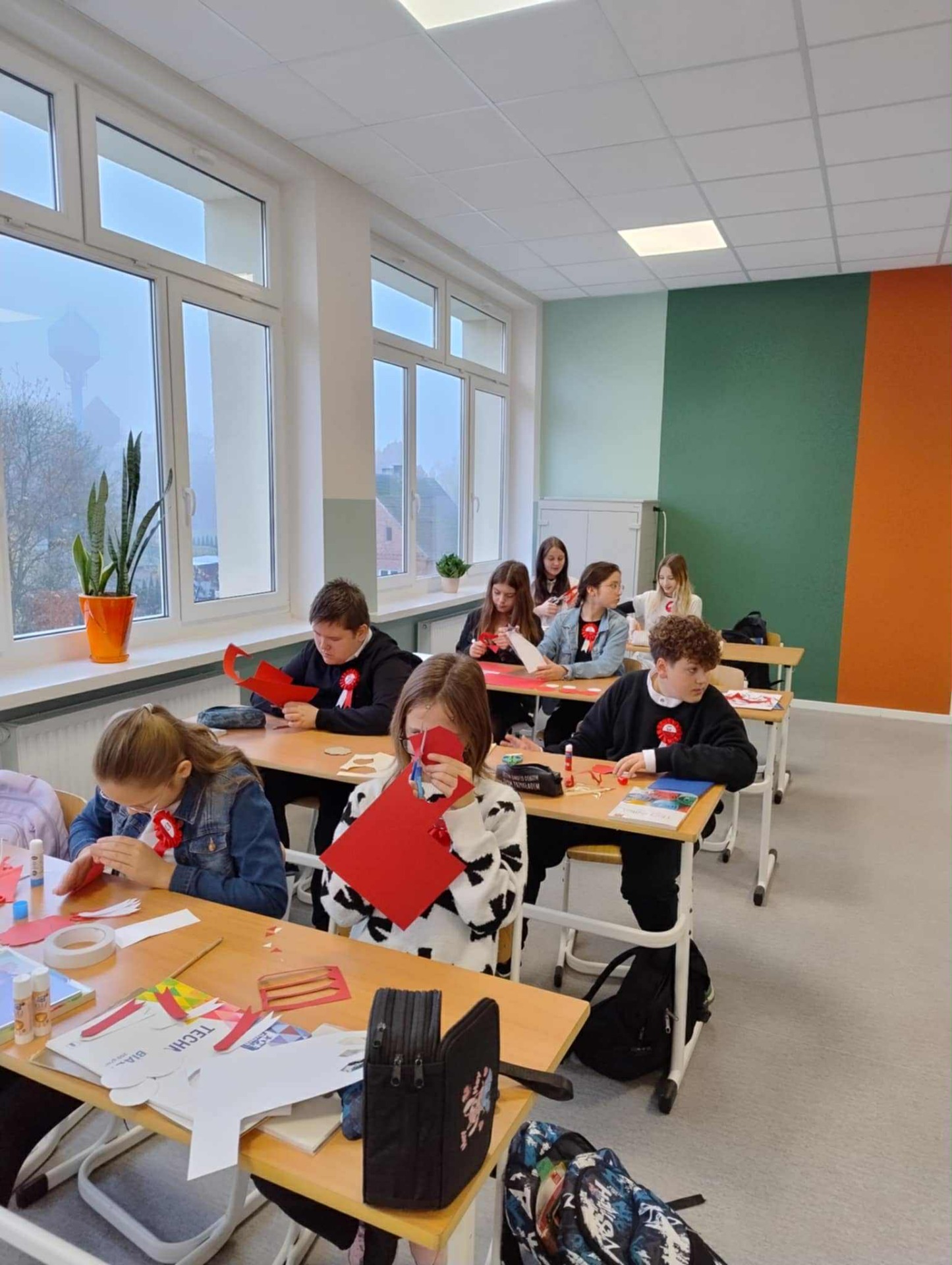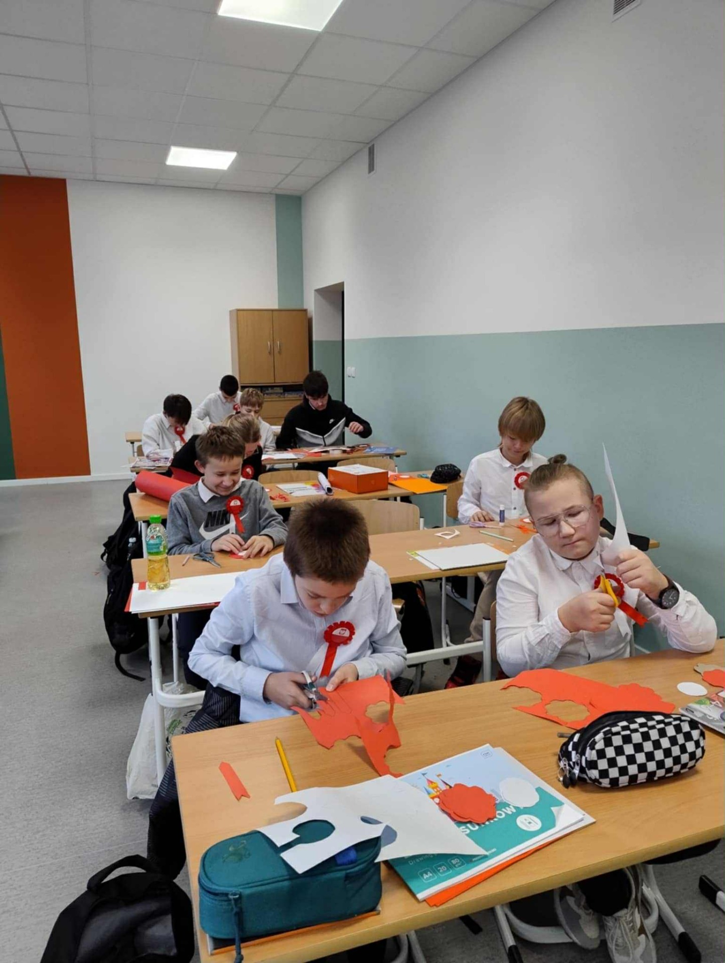 Podczas zajęć plastyki i techniki wykonywali kotyliony patriotyczne, które zostaną rozdane 11 listopada wśród mieszkańców naszej społeczności lokalnej pod Pomnikiem Pamięci Pokoleń.
