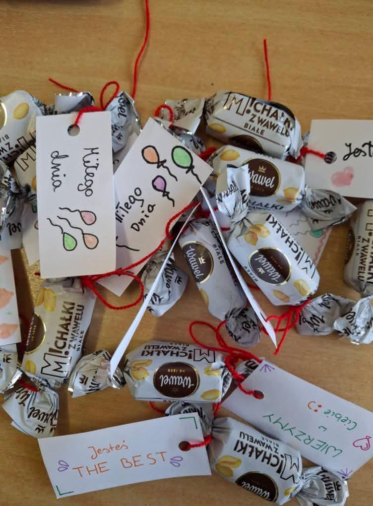 Z tej okazji Samorząd Uczniowski przygotował dla wszystkich klas wyjątkową akcję. Dzień wcześniej każda klasa wylosowała inną klasę, którą miała obdarować drobnymi upominkami, miłymi słowami, pozdrowieniami i życzeniami.