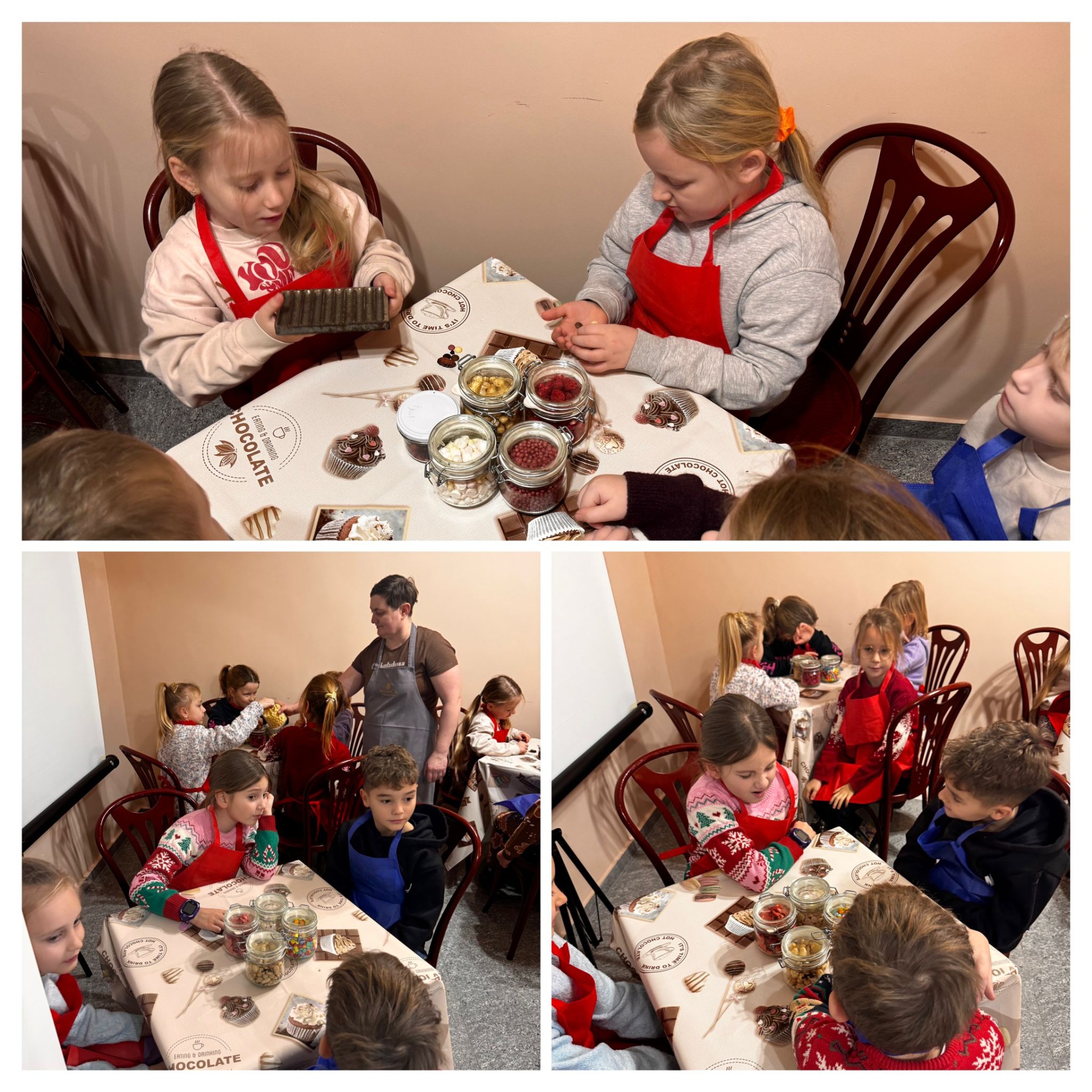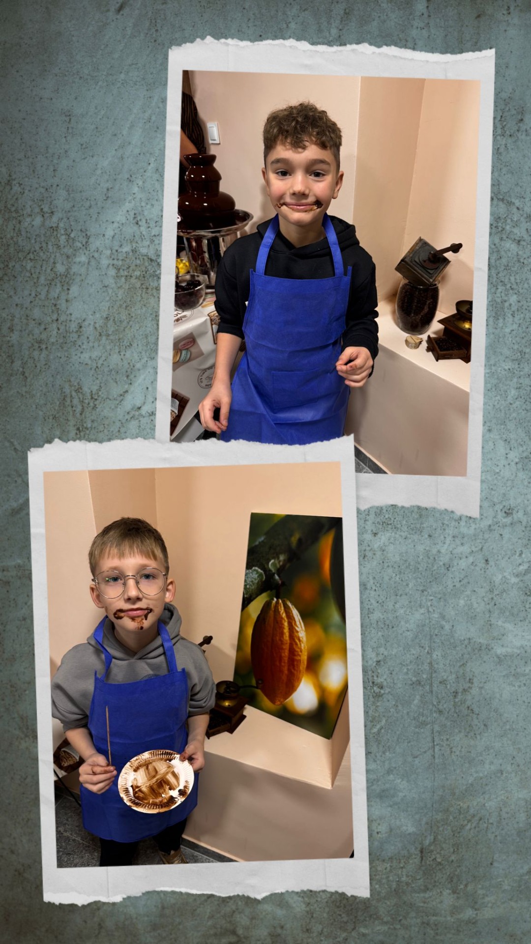 Dzisiaj uczniowie klas 1a i 1c wzięli udział w wyjątkowych warsztatach i pokazach czekoladowych w Fundacji „Czekoladowa Angelika”, prowadzonych przez Panią Izabelę Berendt. Była to nie tylko słodka przygoda, ale także cenna lekcja połączona z zabawą.