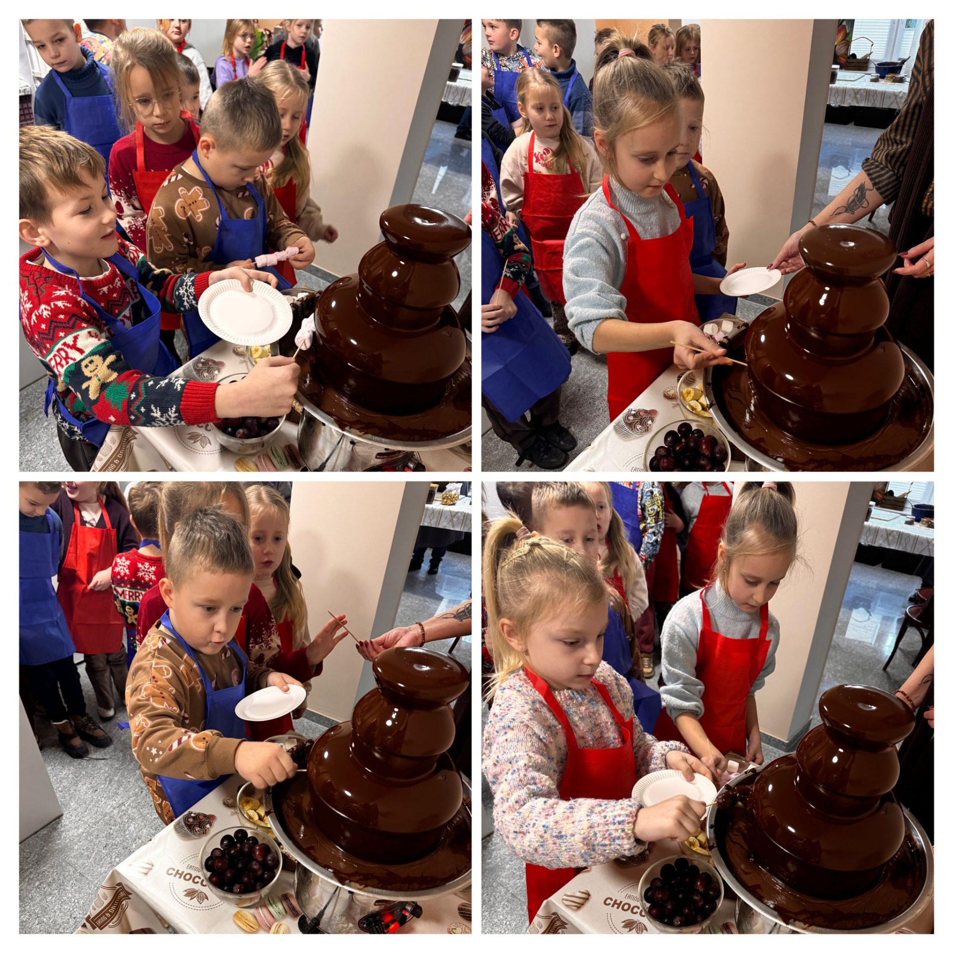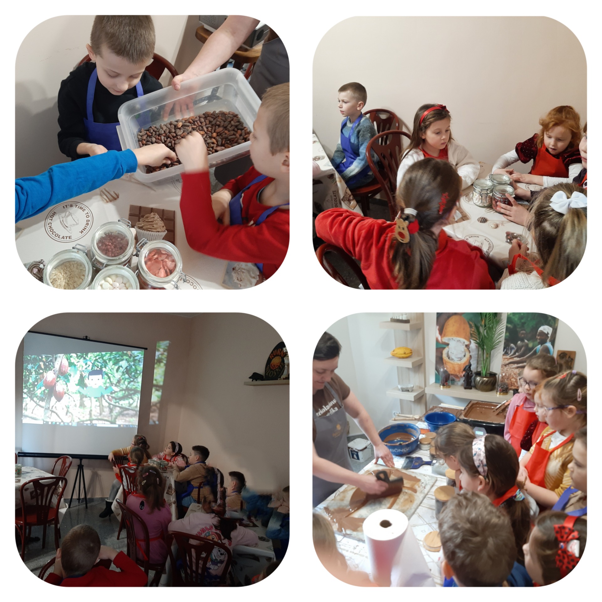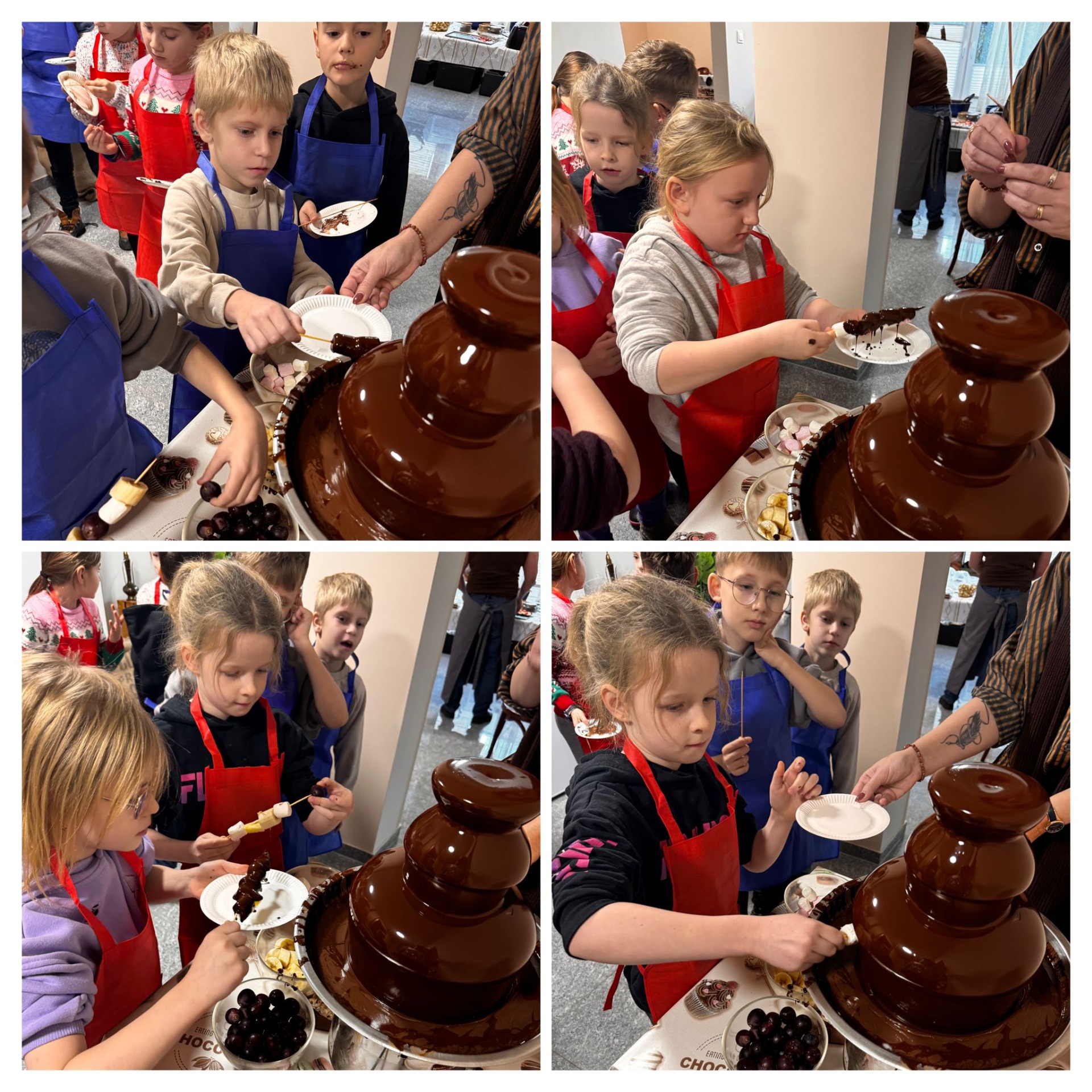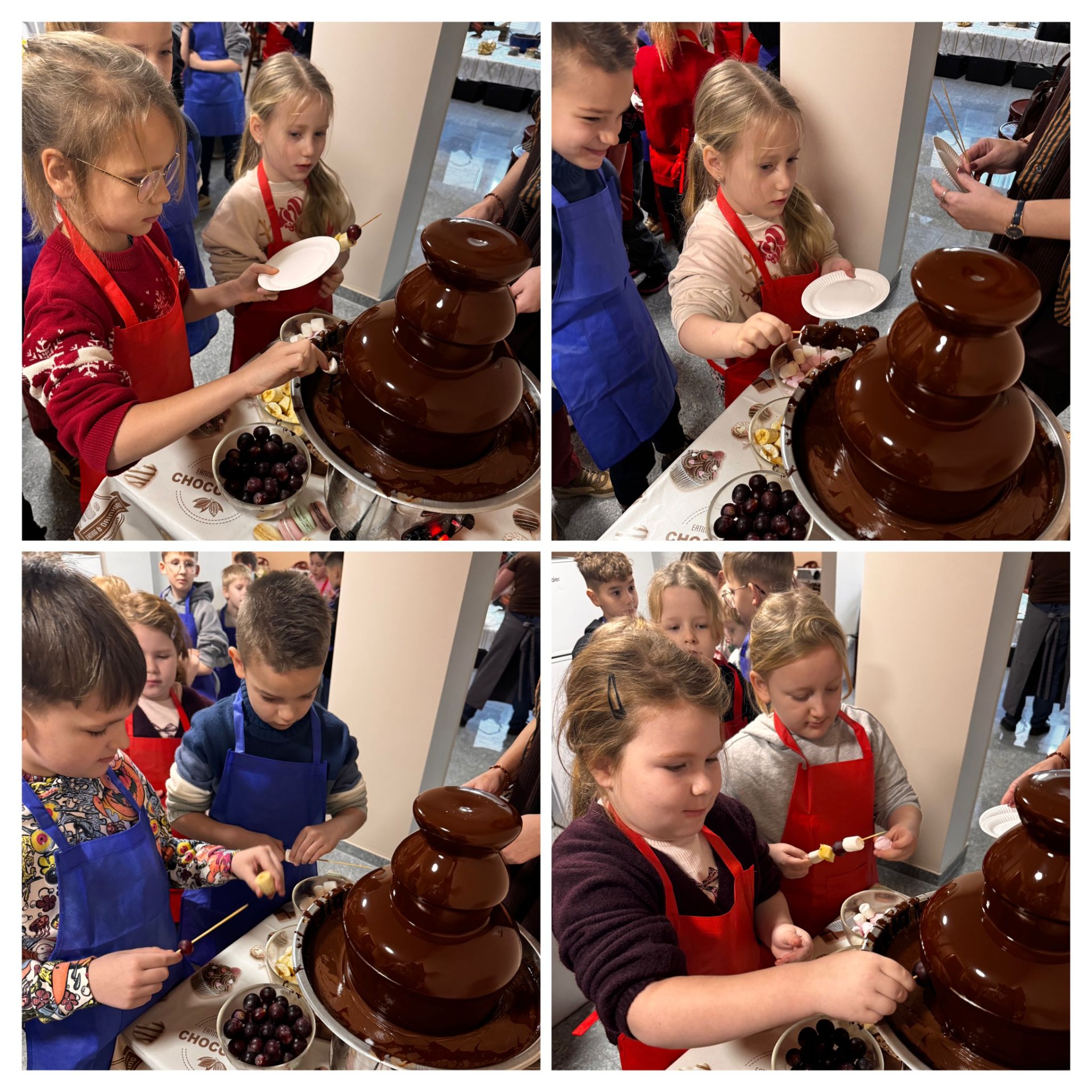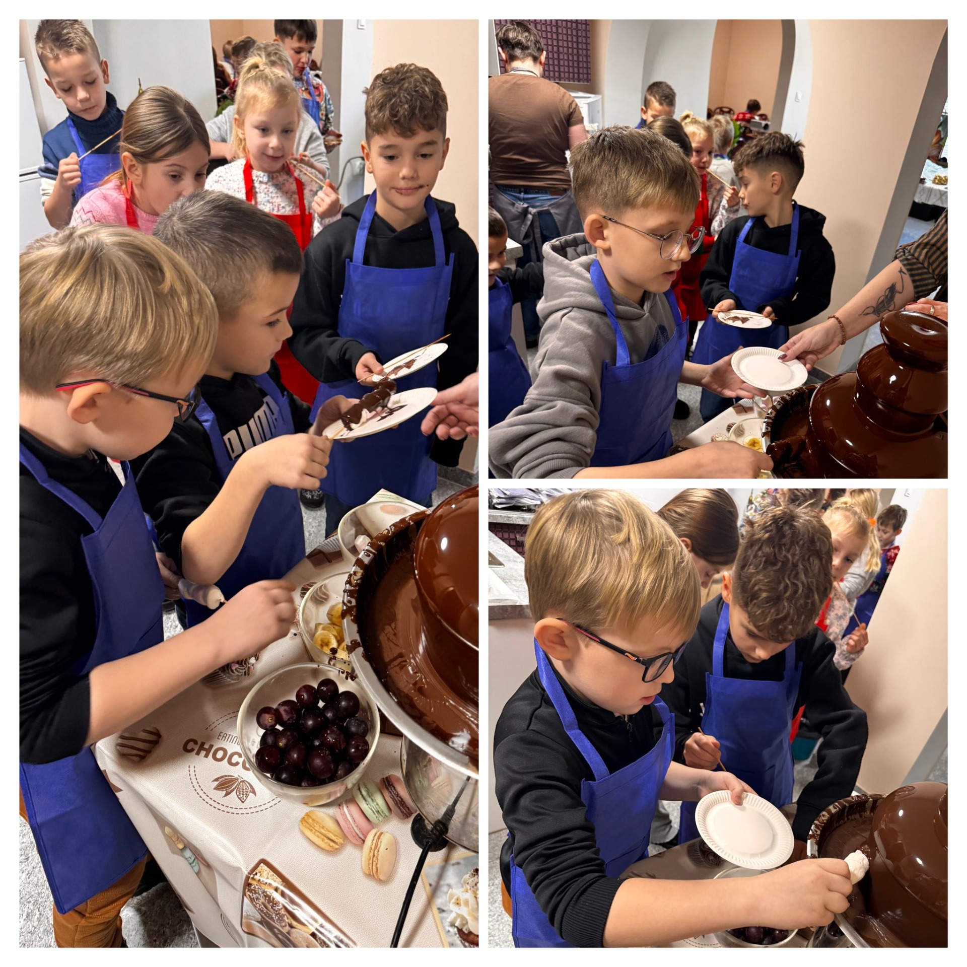 Podczas warsztatów dzieci odkrywały tajniki produkcji czekolady. Uczniowie poznali historię czekolady oraz etapy jej powstawania — od owocu kakaowca aż po gotową tabliczkę, degustowali różne rodzaje czekolady, samodzielnie przygotowywali tabliczkę czekolady z wybranymi dodatkami, a na koniec kosztowali smakołyków z fontanny czekoladowej, która wzbudziła ogromny entuzjazm.