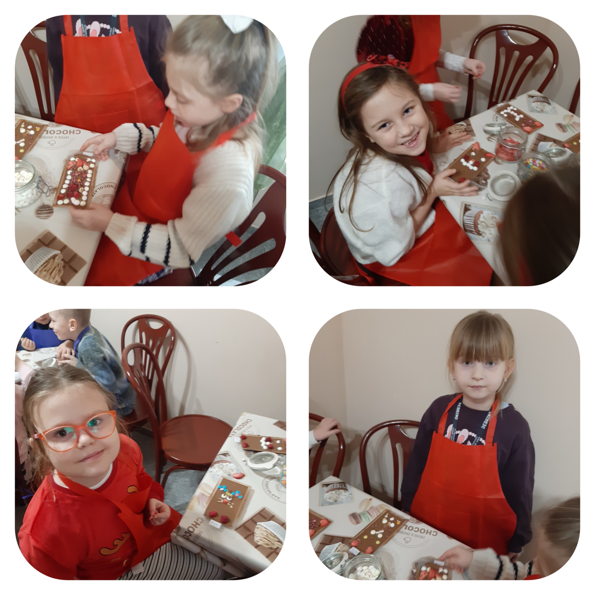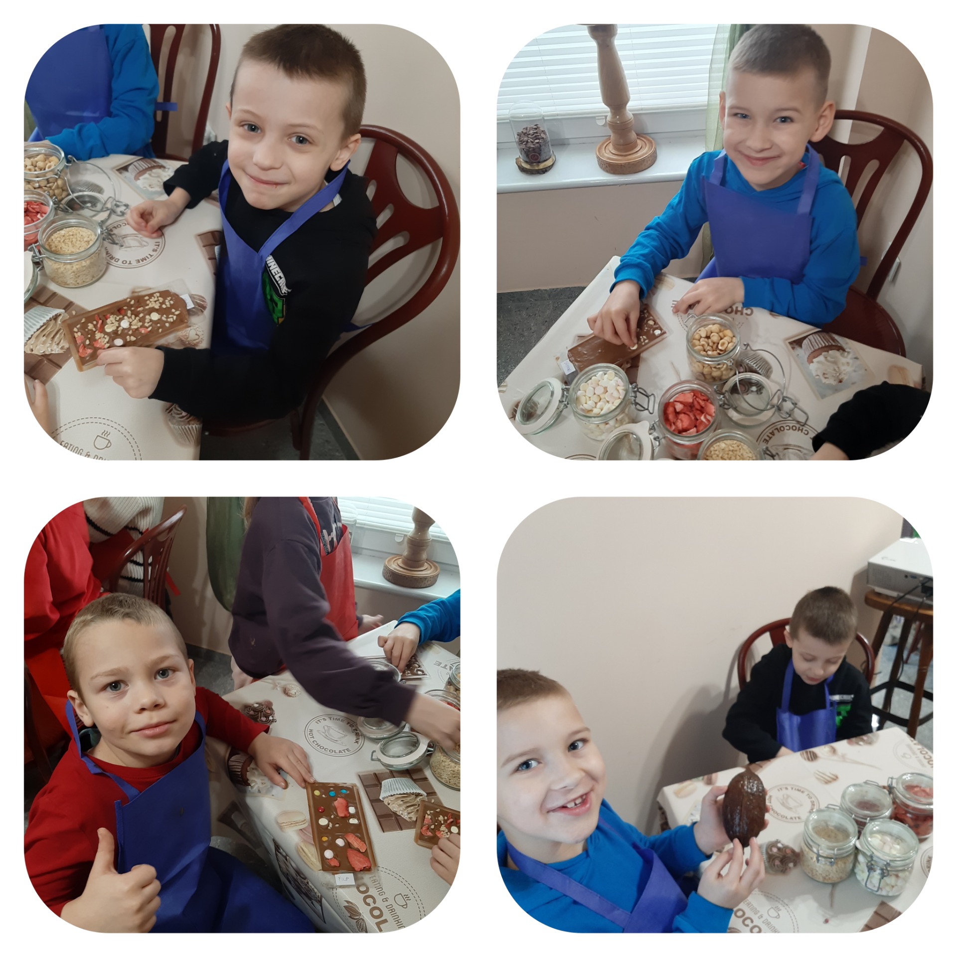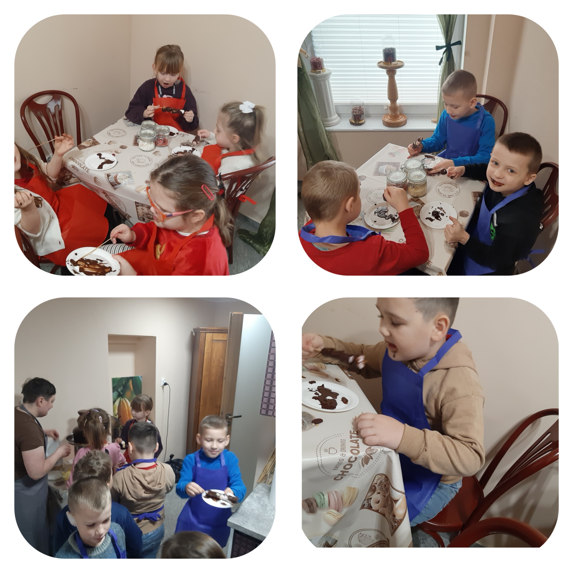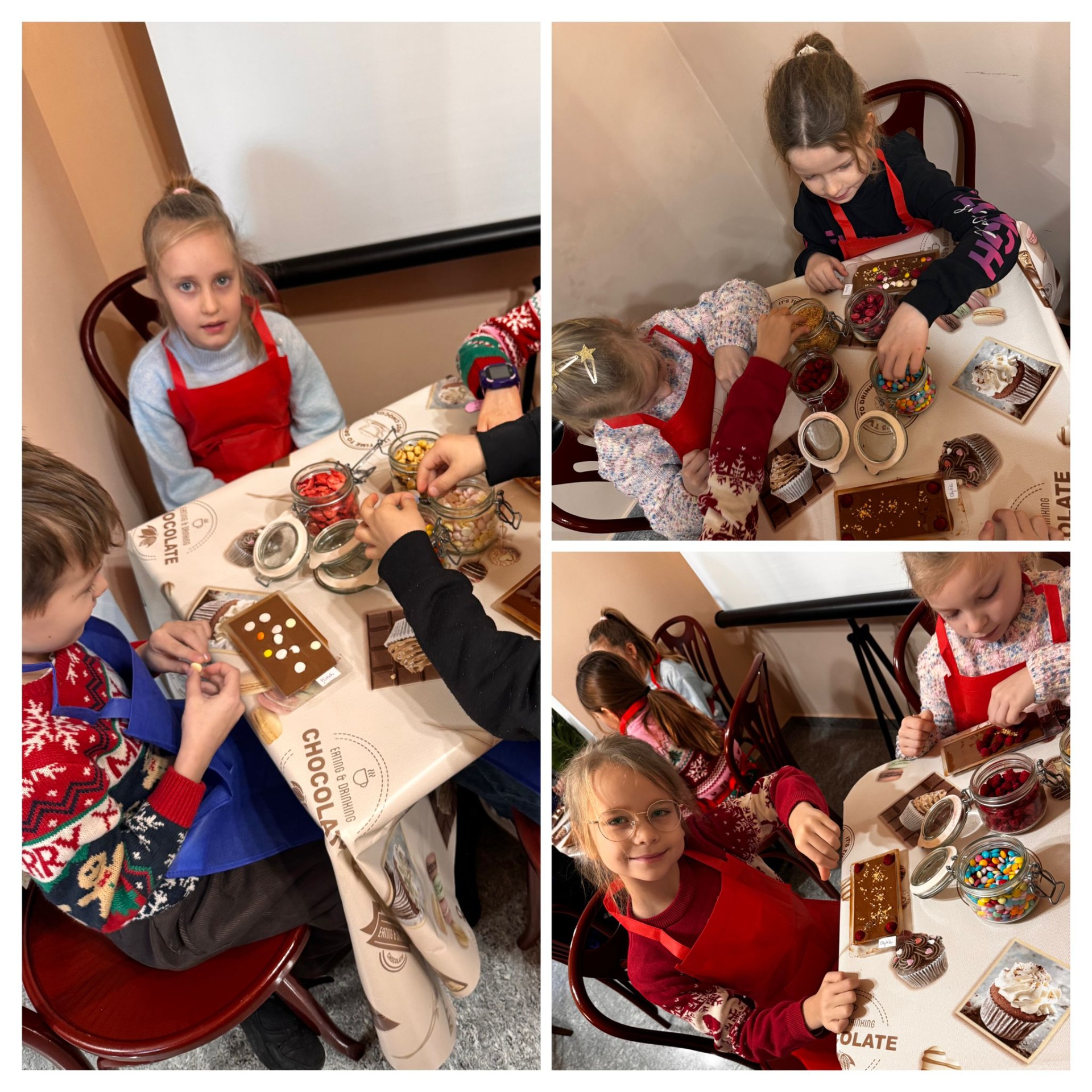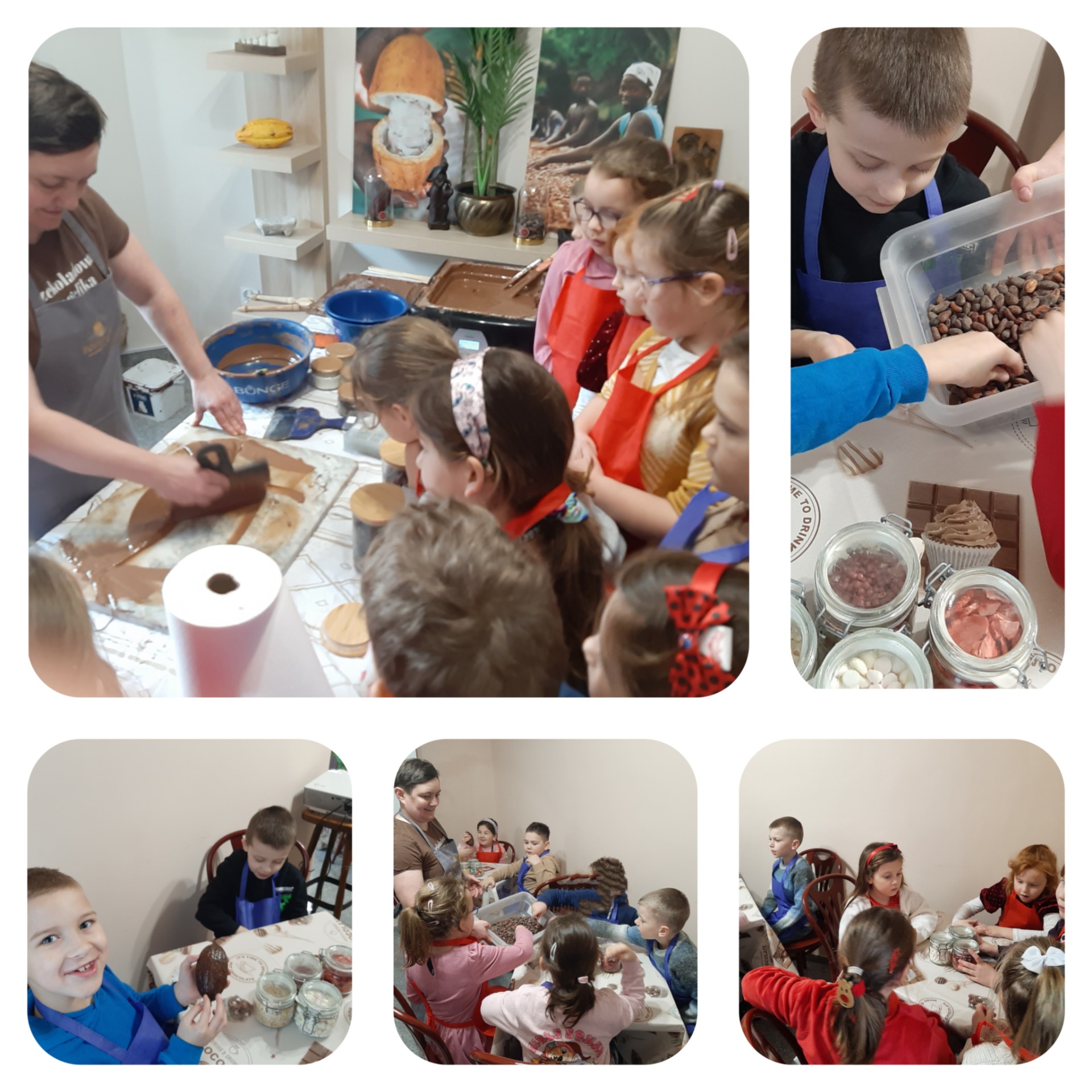 Podczas warsztatów dzieci odkrywały tajniki produkcji czekolady. Uczniowie poznali historię czekolady oraz etapy jej powstawania — od owocu kakaowca aż po gotową tabliczkę, degustowali różne rodzaje czekolady, samodzielnie przygotowywali tabliczkę czekolady z wybranymi dodatkami, a na koniec kosztowali smakołyków z fontanny czekoladowej, która wzbudziła ogromny entuzjazm.